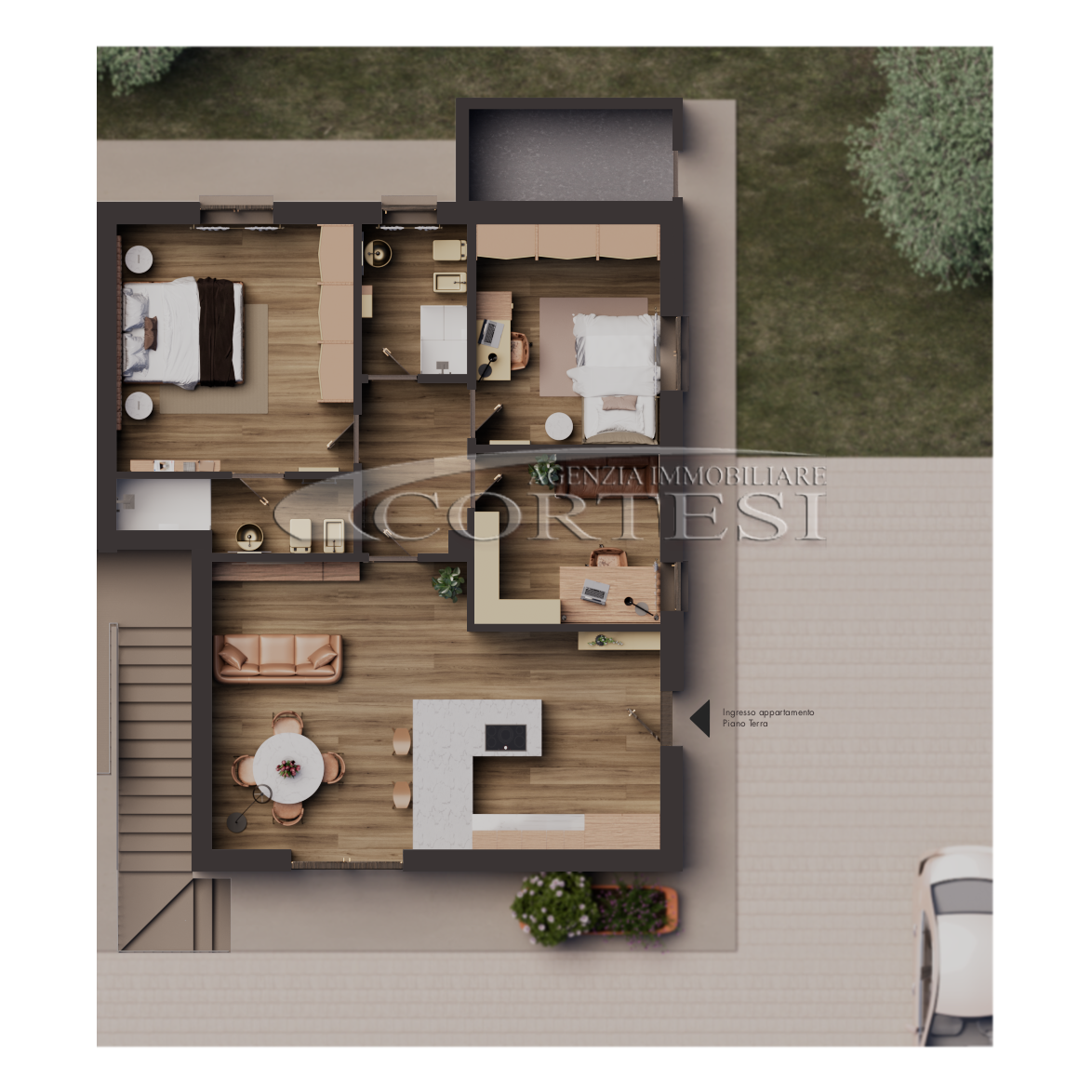 - Due appartamenti a piano terra di mq 100 con ingresso indipendente composti da ampio soggiorno, cucina, tre camere, due bagni, locale tecnico, giardino e scoperto privato di mq 100 e posto auto.