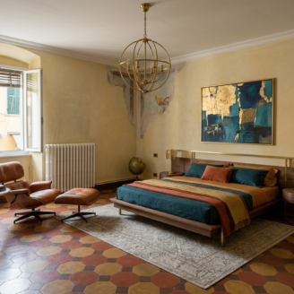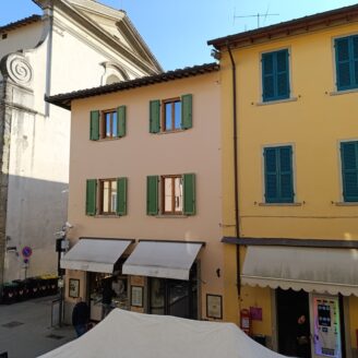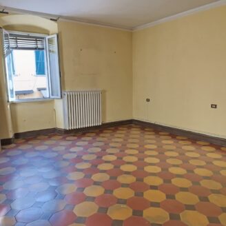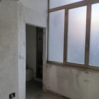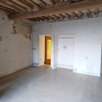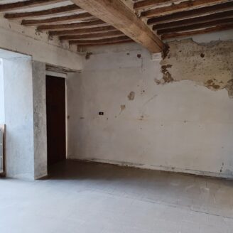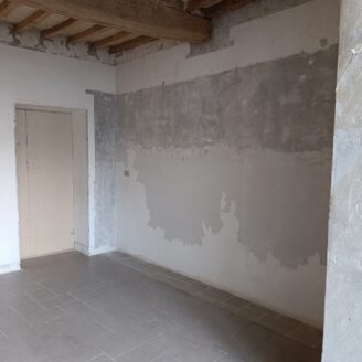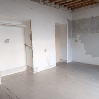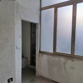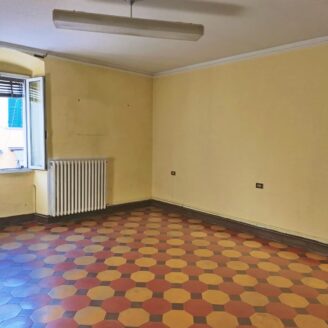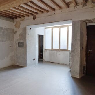 L’immobile ha un fascino autentico: i pavimenti sono originali del 1800 e sulle pareti si intravedono tracce di affreschi antichi. Lo spazio si apre sulla zona giorno dove, come mostrano i rendering, è prevista una cucina con area living, adiacente c’è il bagno, mentre dalla sala si passa alla camera da letto, molto grande e con la finestra che affaccia proprio sul corso.