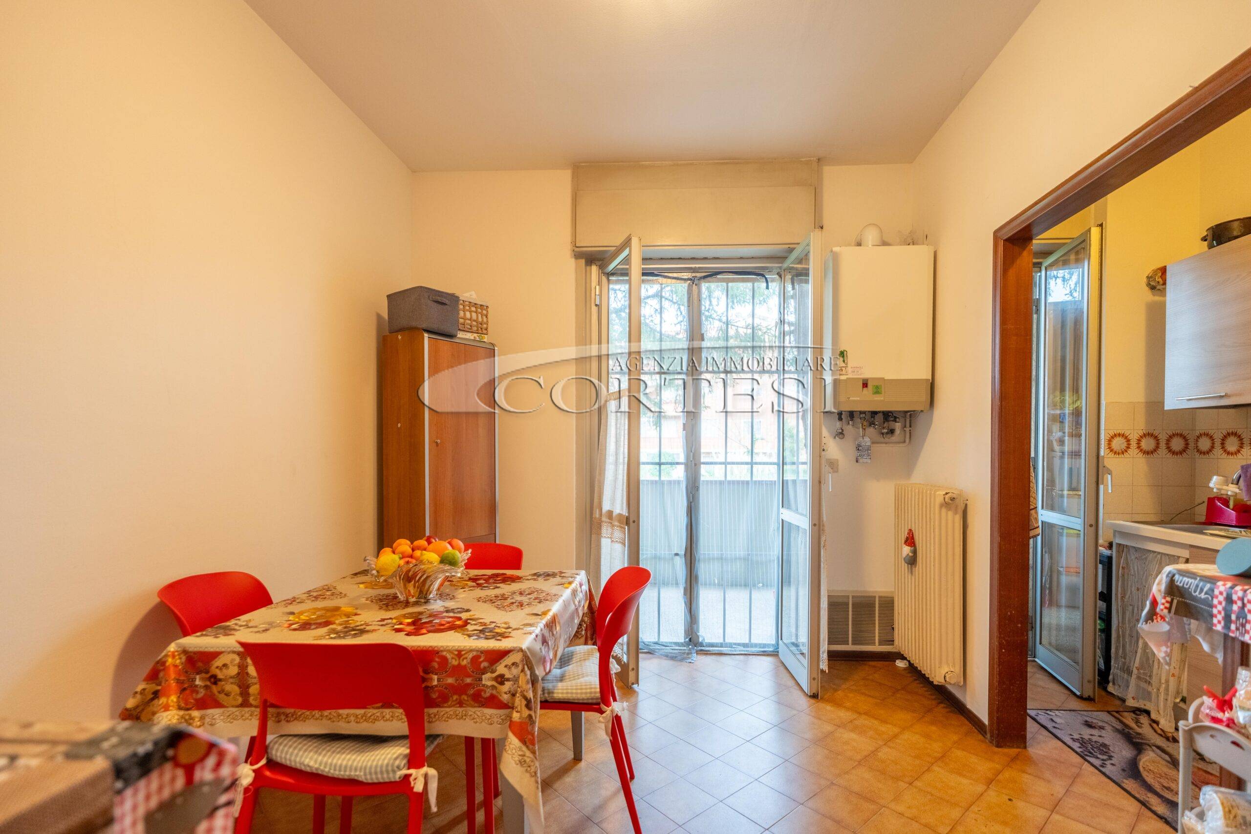 L’abitazione si compone di ingresso, cucinotto, sala da pranzo con accesso diretto al balcone, camera matrimoniale, cameretta/studio e bagno finestrato, offrendo ambienti funzionali e ben distribuiti.