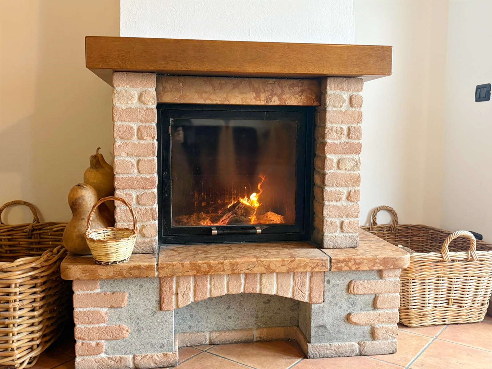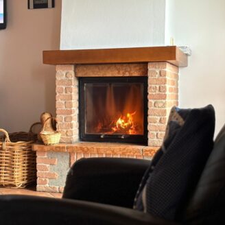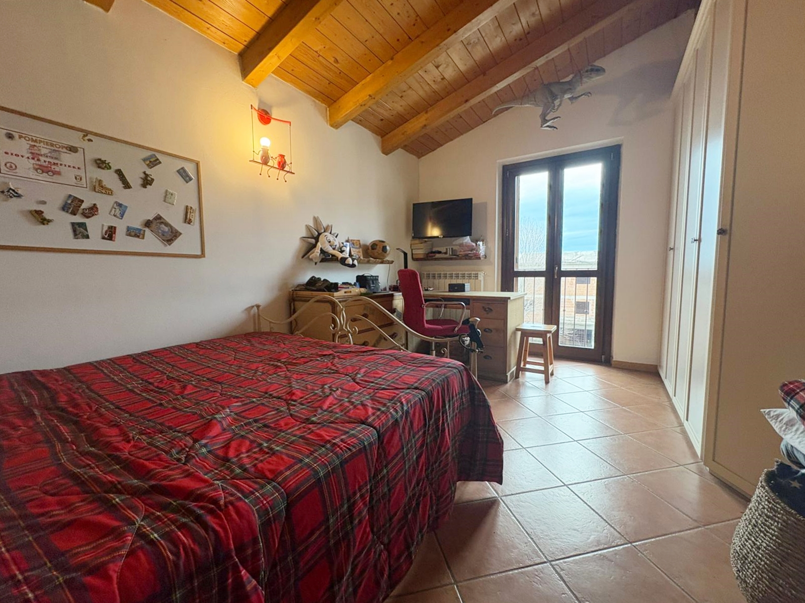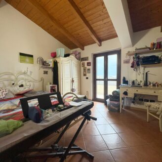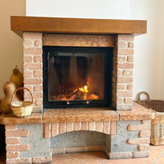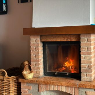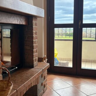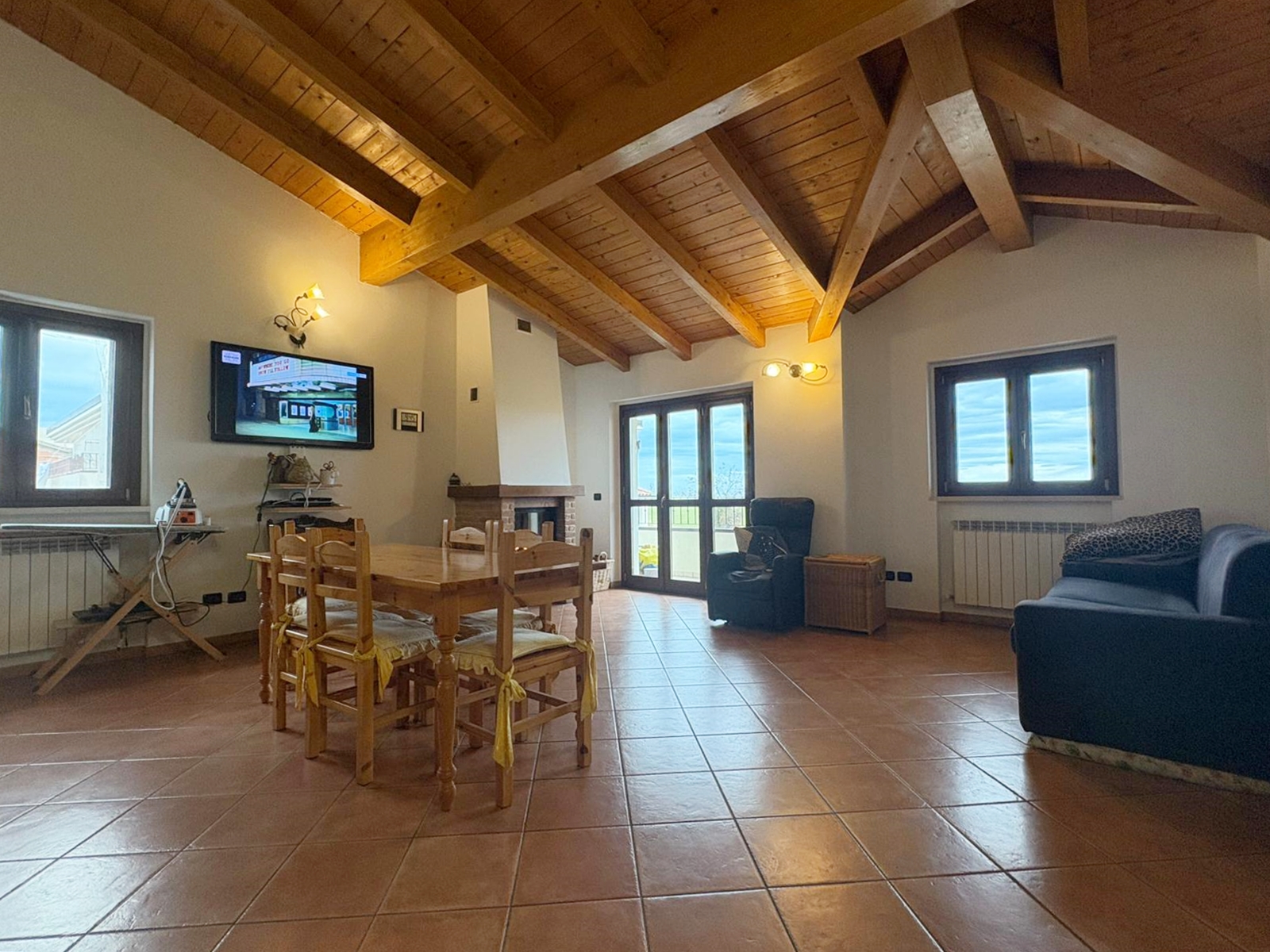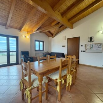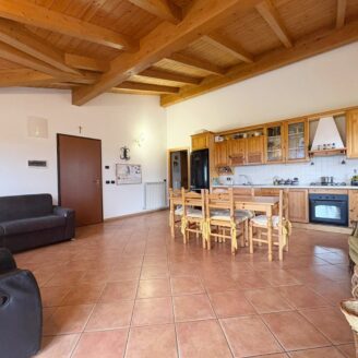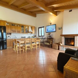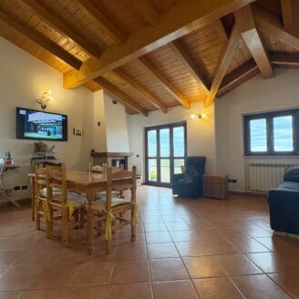 L’ingresso conduce a un ampio e luminoso soggiorno open-space, impreziosito da raffinate travi a vista e da un camino, elemento ideale per creare un’atmosfera calda e accogliente.