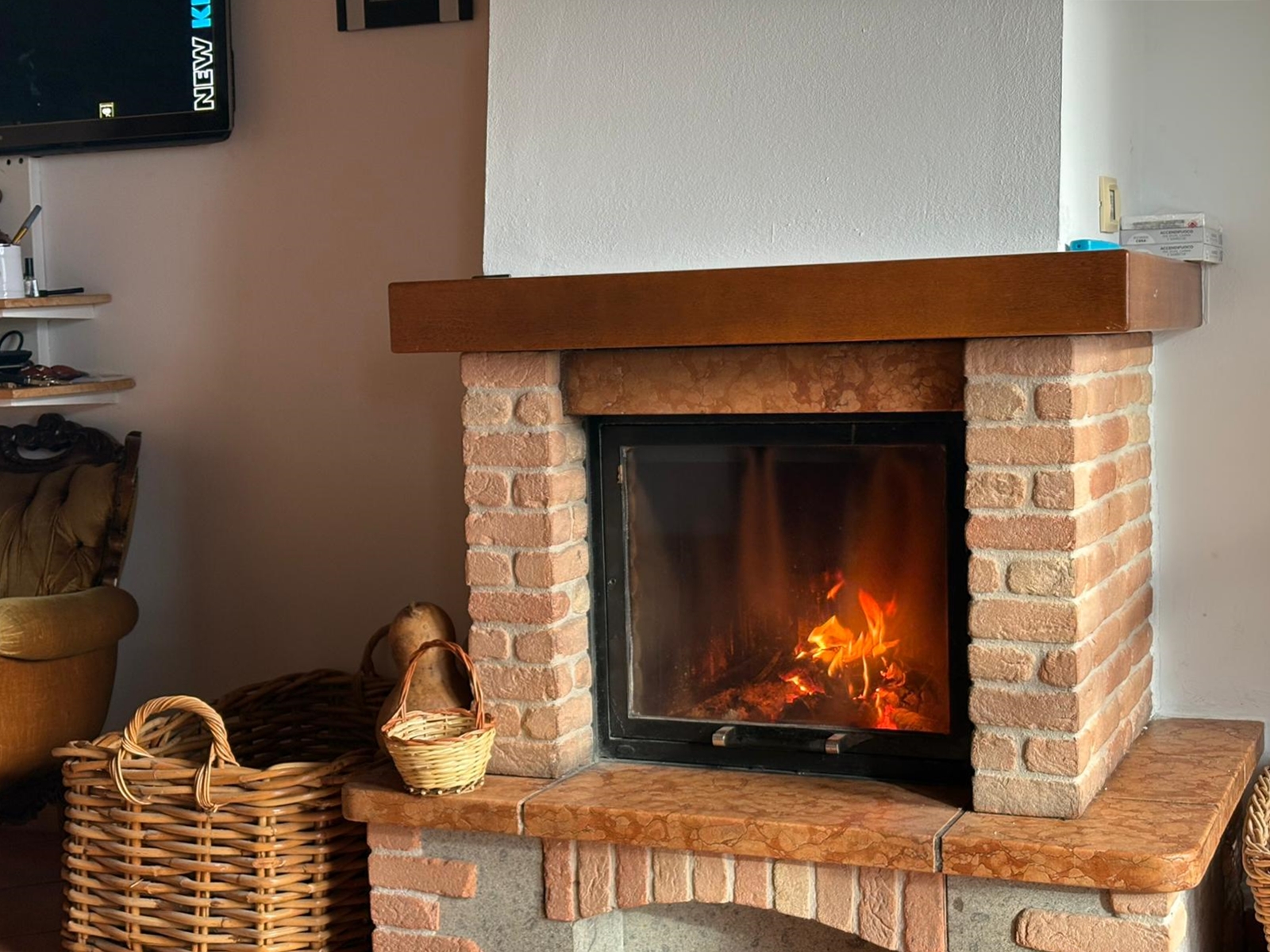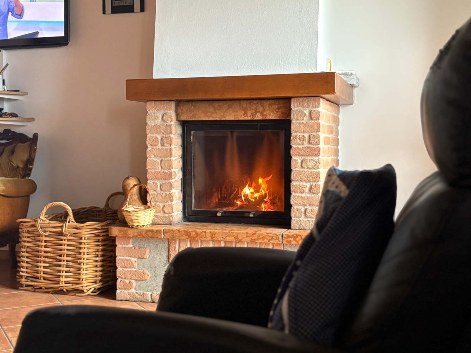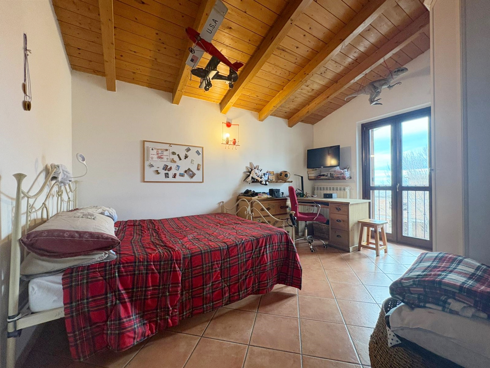 L’ingresso conduce a un ampio e luminoso soggiorno open-space, impreziosito da raffinate travi a vista e da un camino, elemento ideale per creare un’atmosfera calda e accogliente.