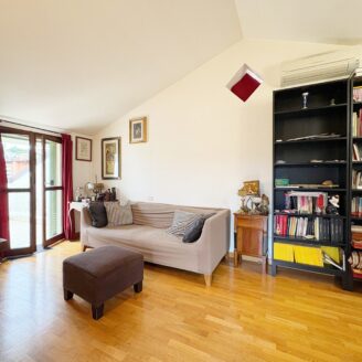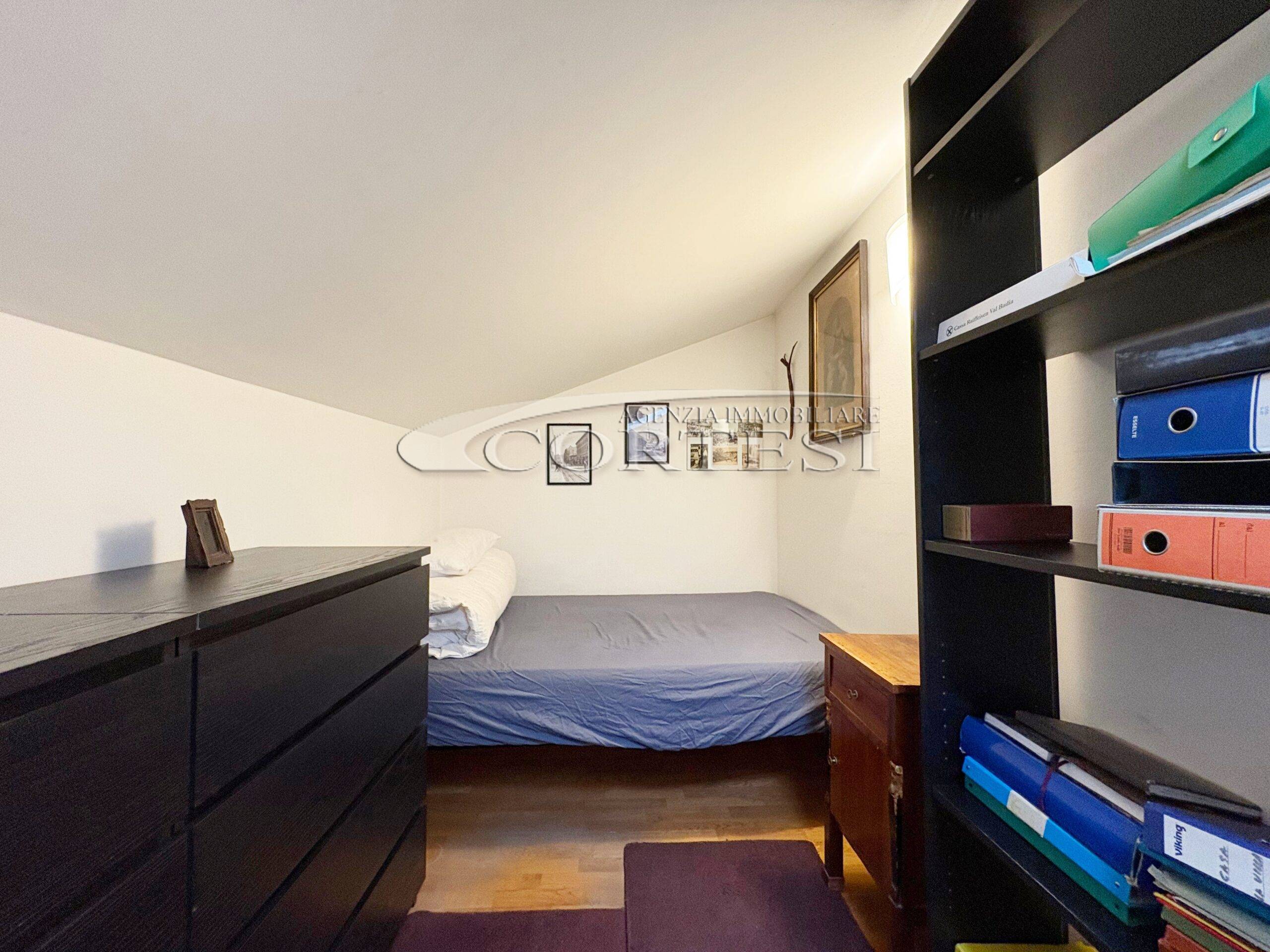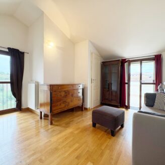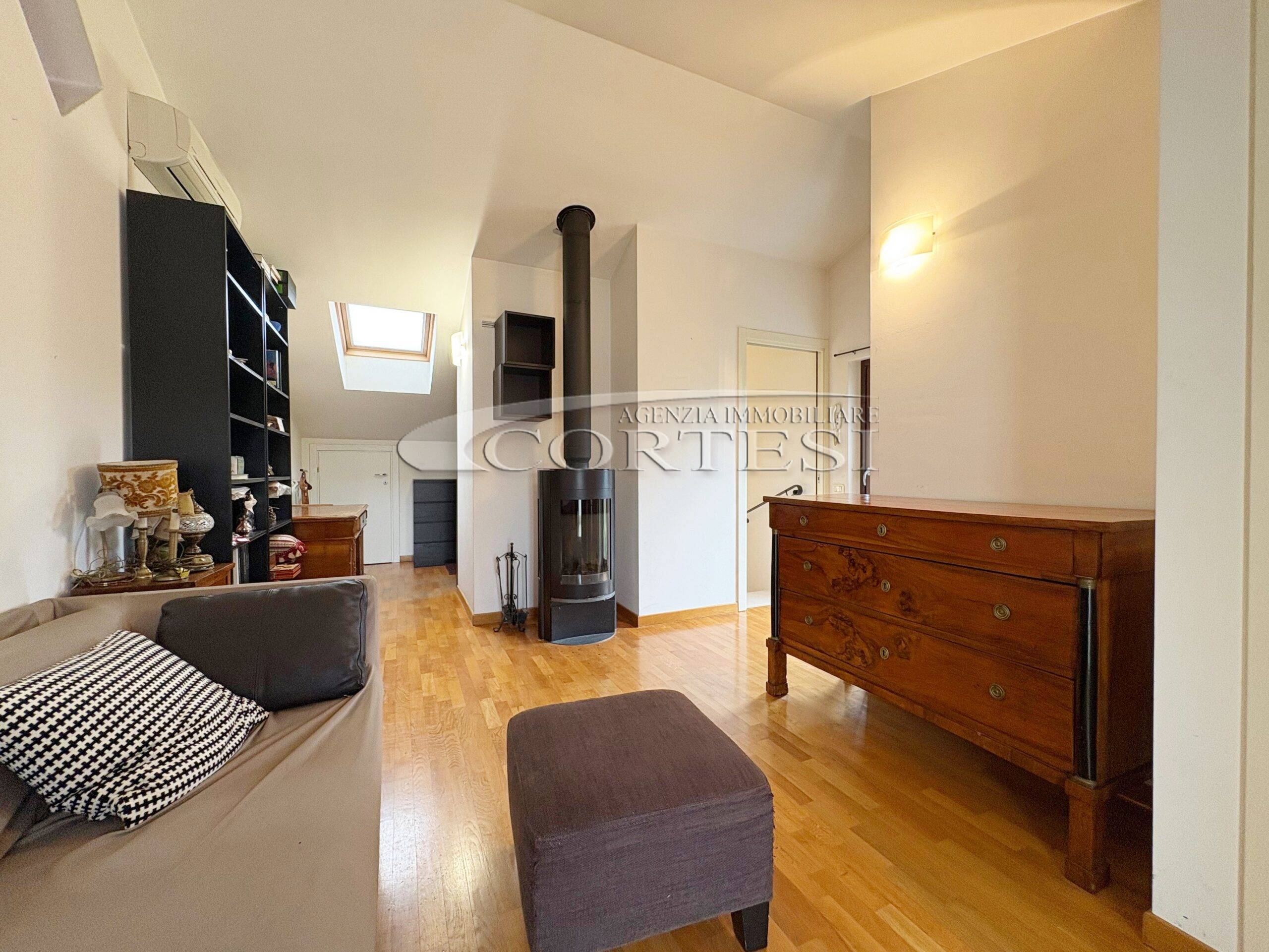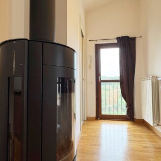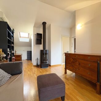 Tramite una comoda scala si accede direttamente al piano mansardato composto da un’ ampia zona living con moderna stufa a legna e bagno.