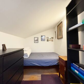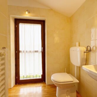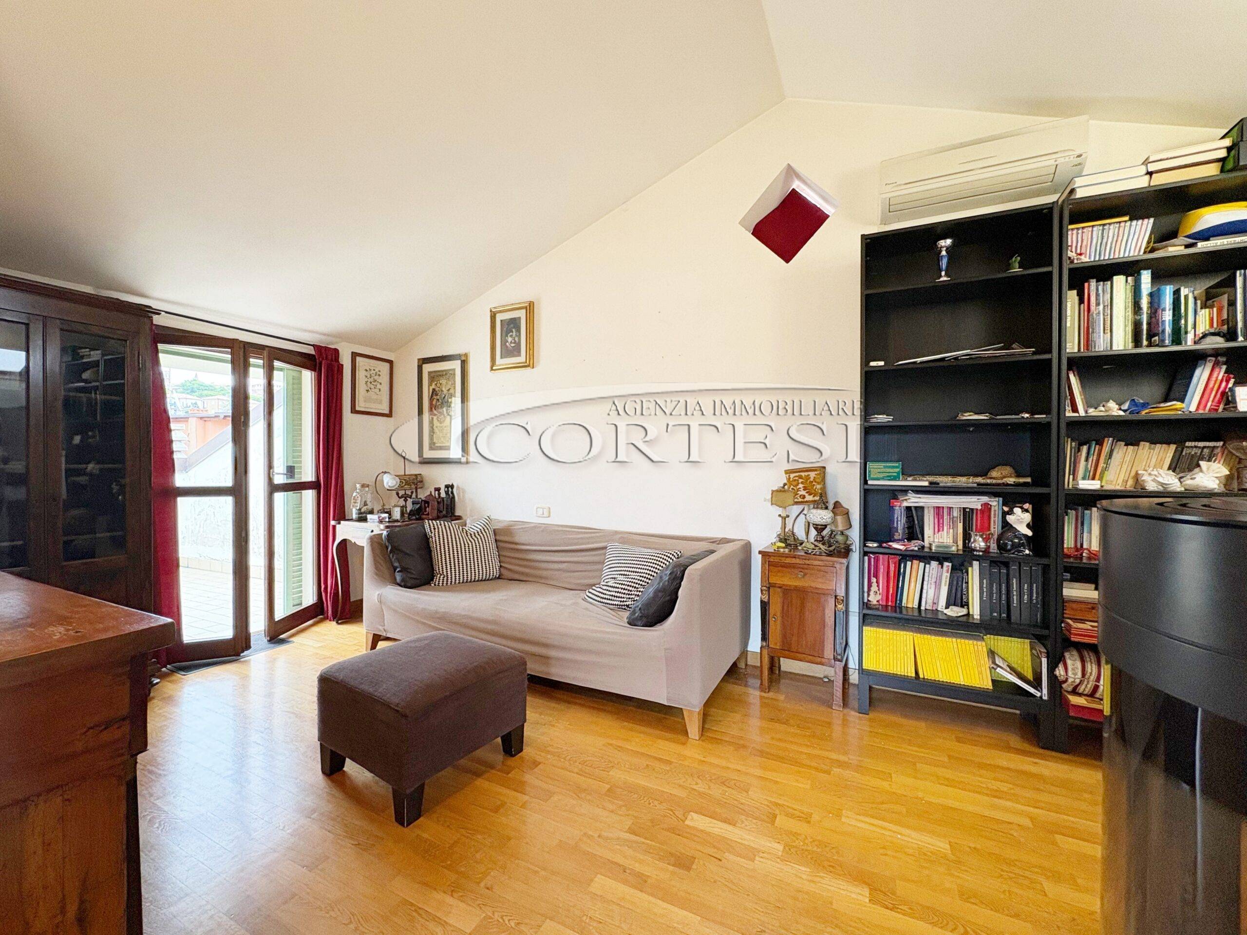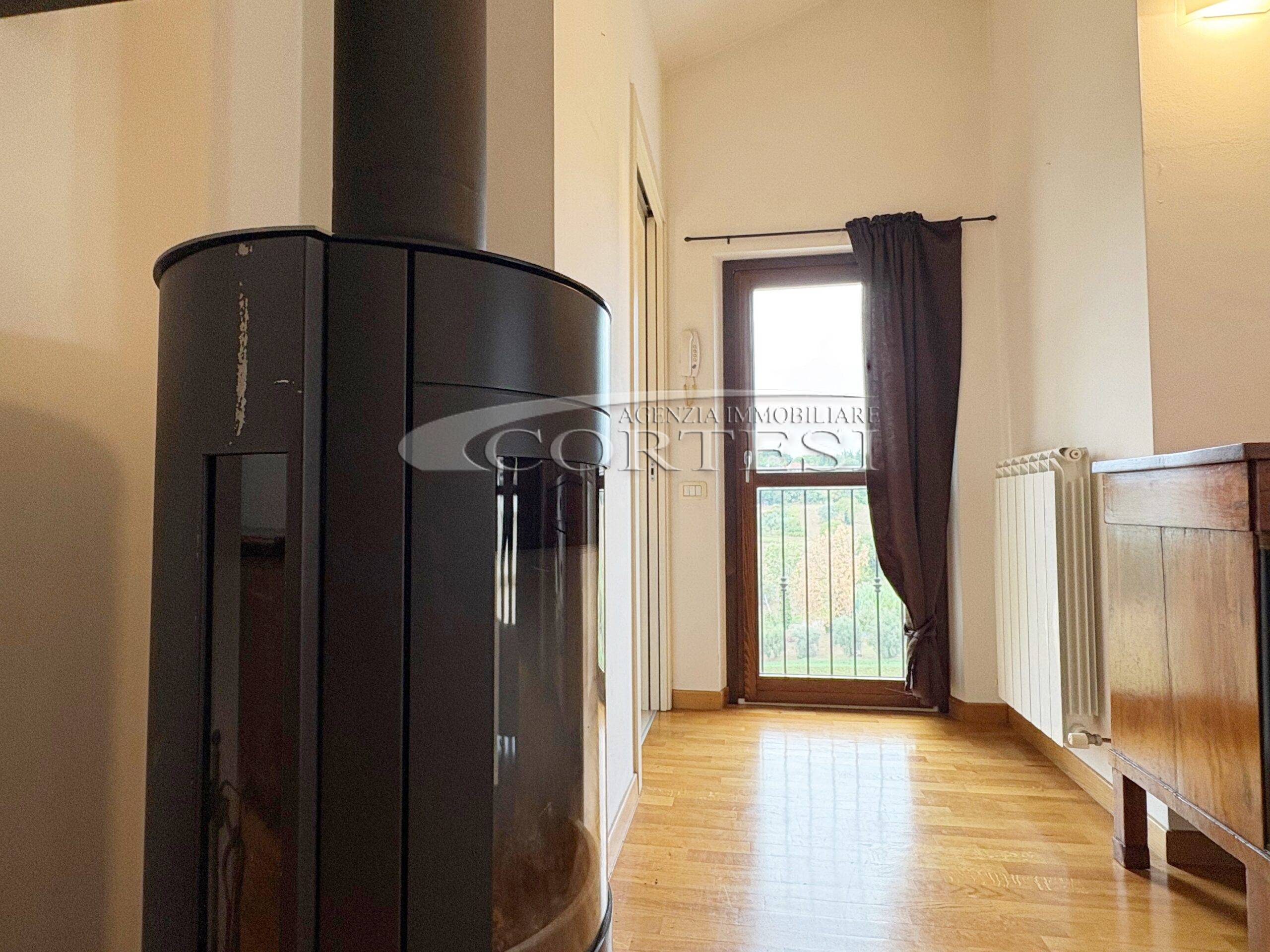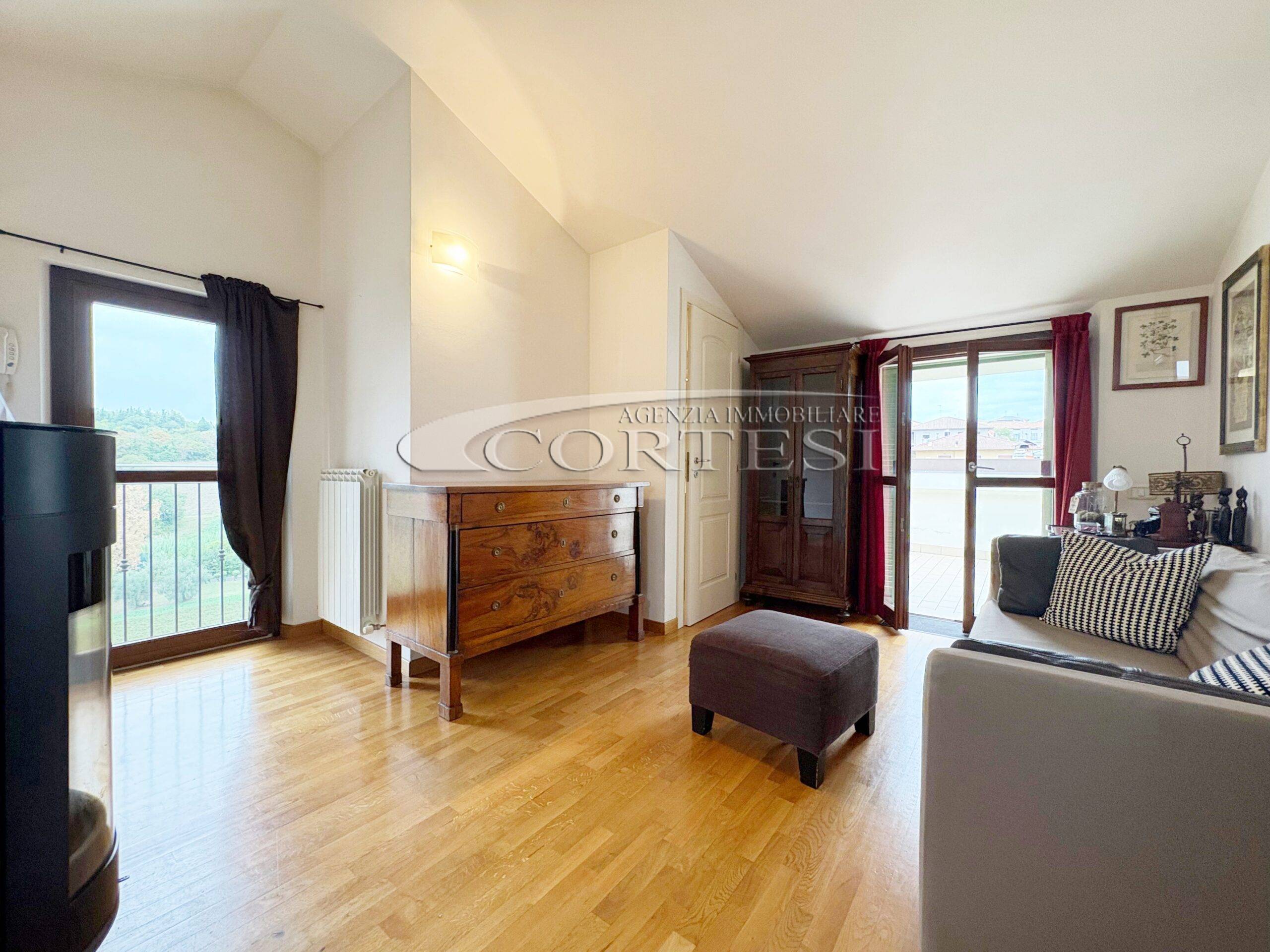 Tramite una comoda scala si accede direttamente al piano mansardato composto da un’ ampia zona living con moderna stufa a legna e bagno.