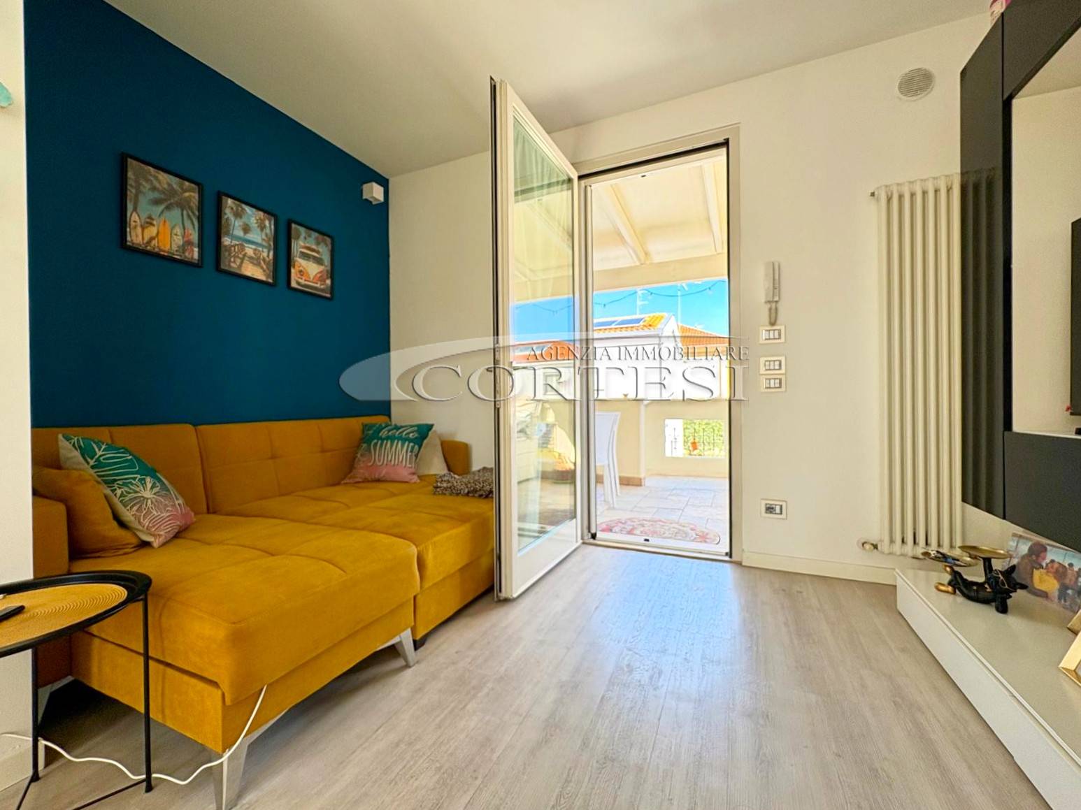 Il piano principale comprende un luminoso soggiorno con cucina a vista, un bagno con finestra e doccia e una spaziosa loggia coperta, ideale per pranzi all’aperto.