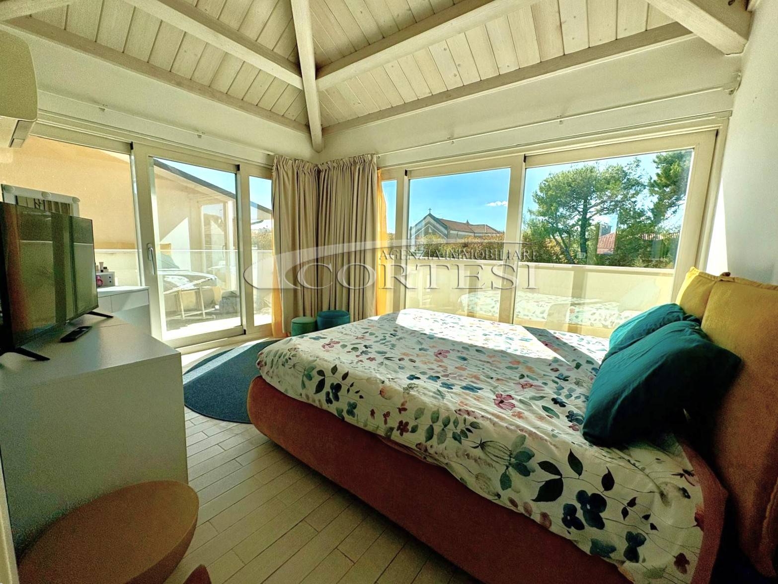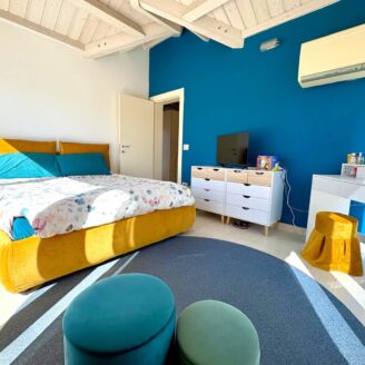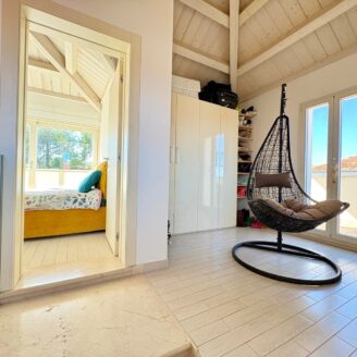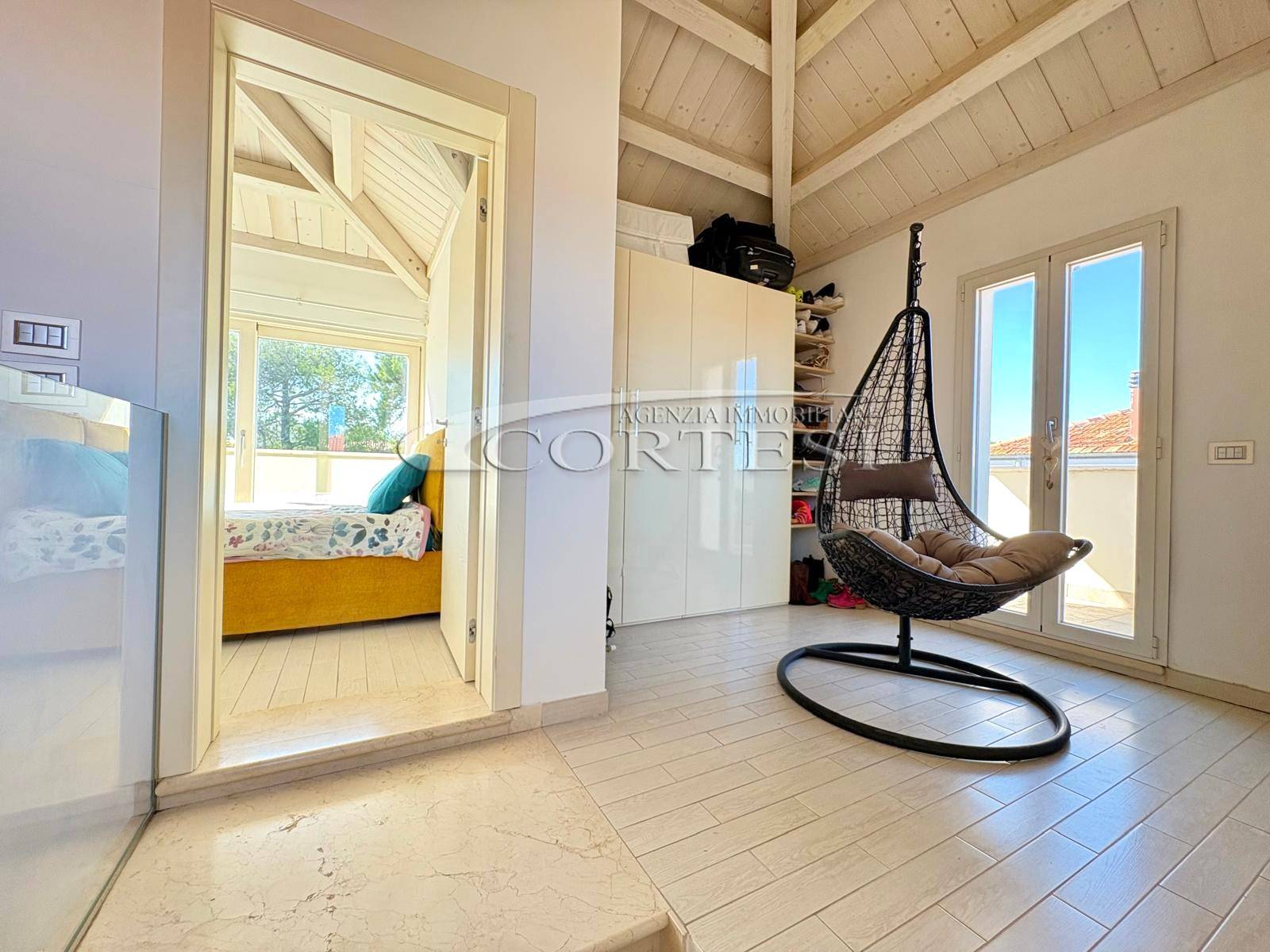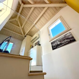 Gli ambienti sono valorizzati dalle travi in legno a vista sbiancate, con altezze fino a 3,70 metri, che donano calore e carattere all’abitazione.
