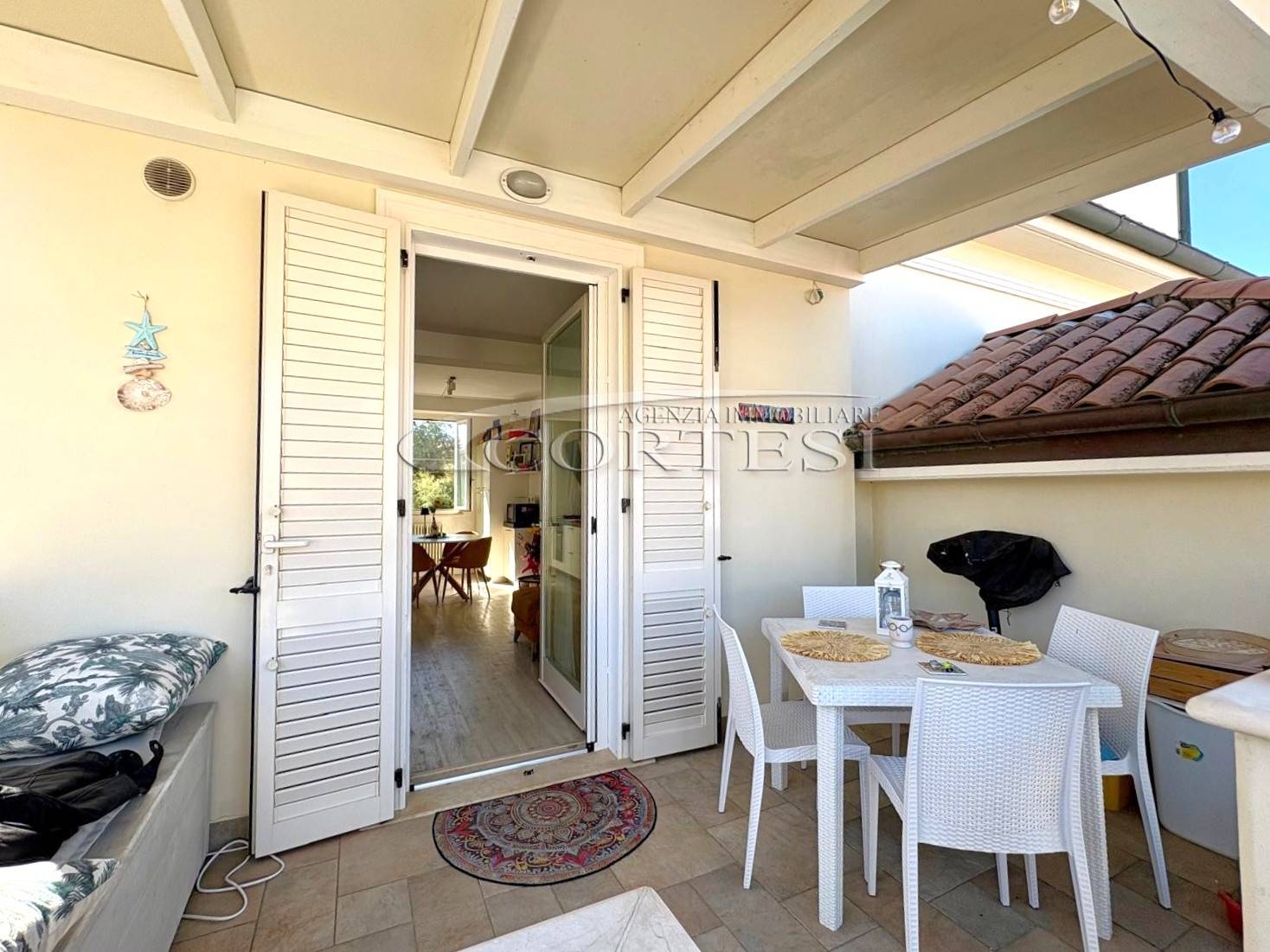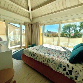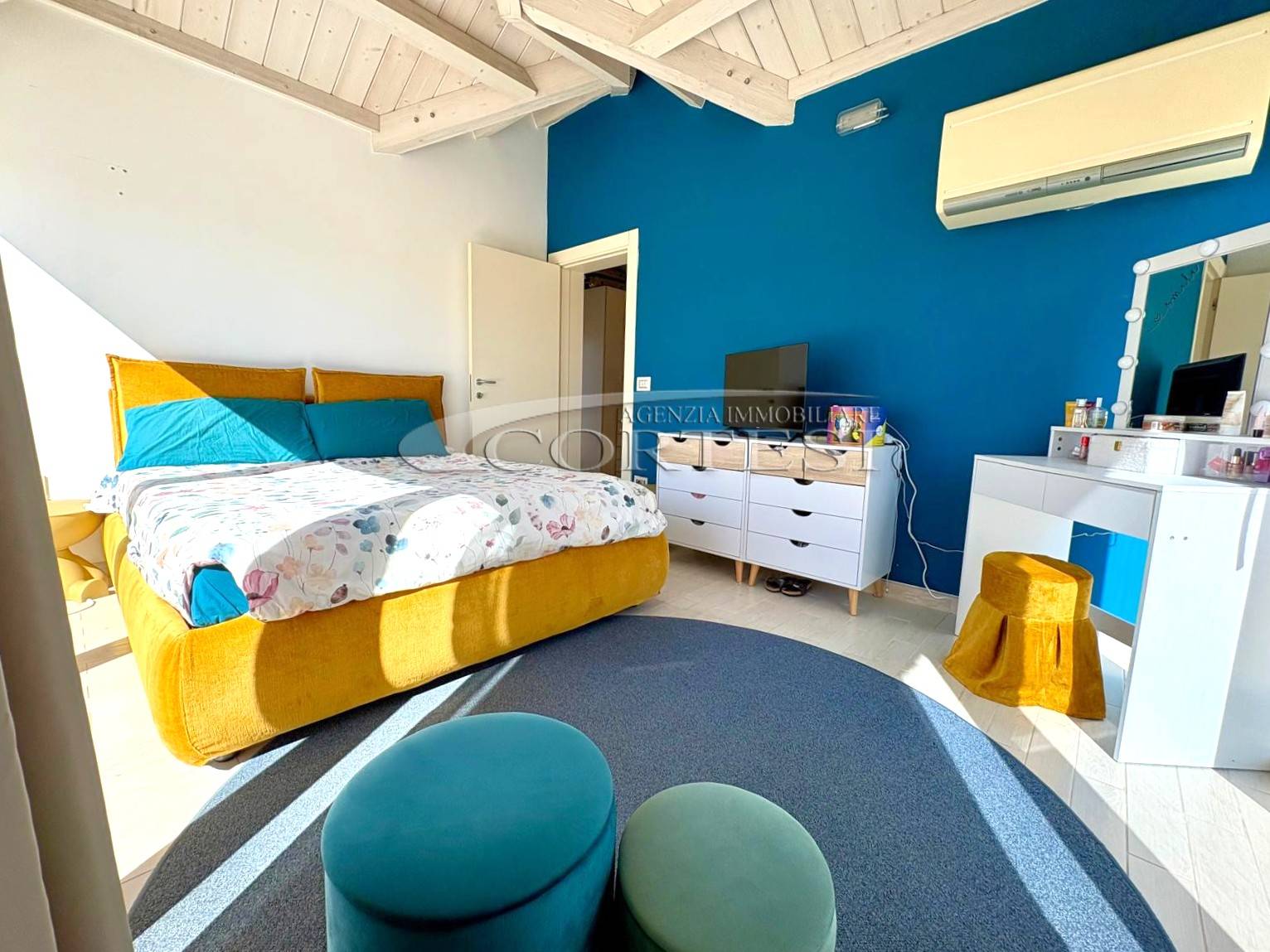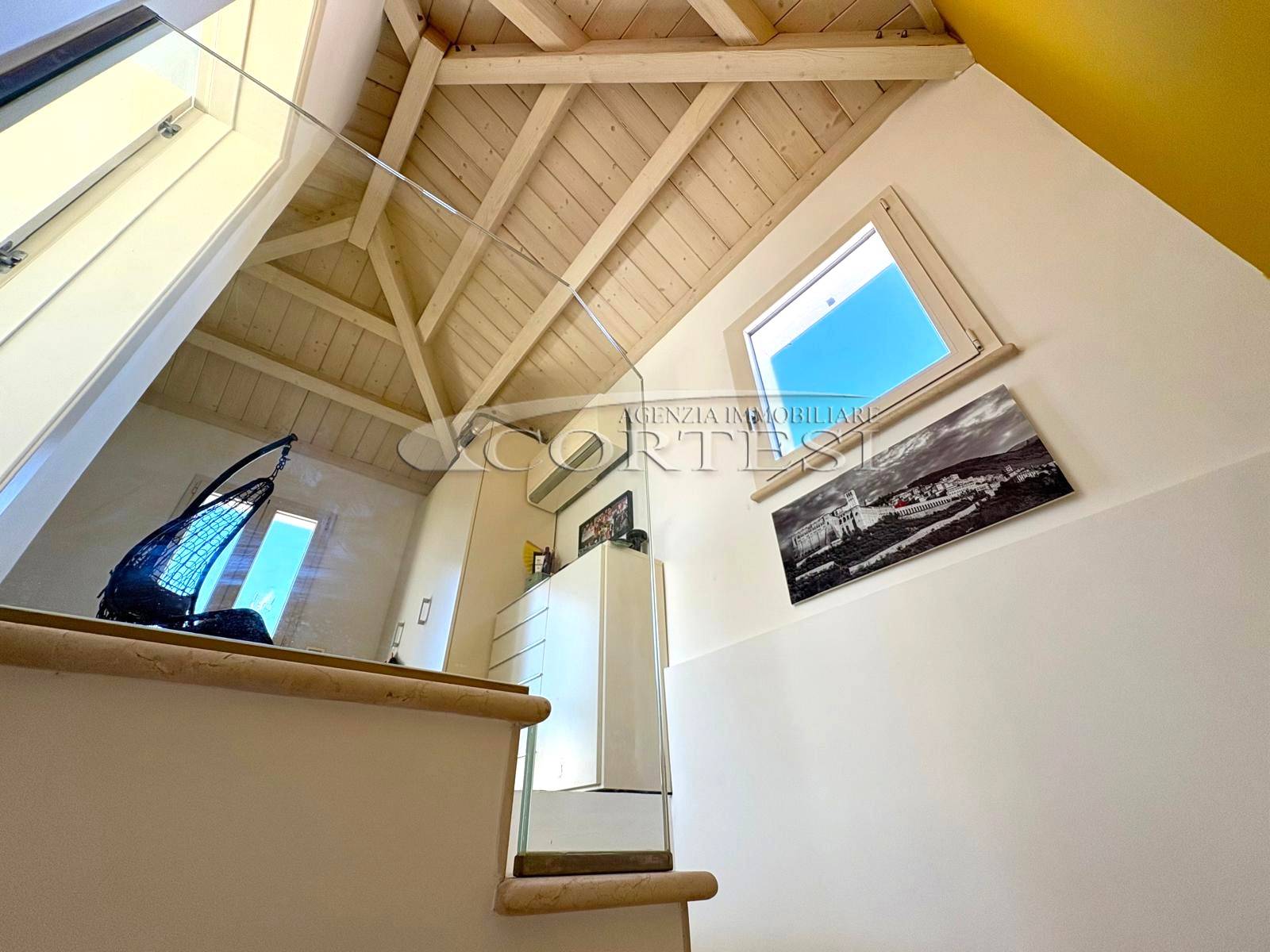 Gli ambienti sono valorizzati dalle travi in legno a vista sbiancate, con altezze fino a 3,70 metri, che donano calore e carattere all’abitazione.