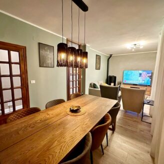 La zona giorno comprende una cucina abitabile con aria condizionata e accesso a un terrazzo. Segue un ambiente open space con sala da pranzo e salotto dotato di idrostufa. La sala presenta finestre con tende lungo il perimetro e accesso al terrazzo abitabile arredato.