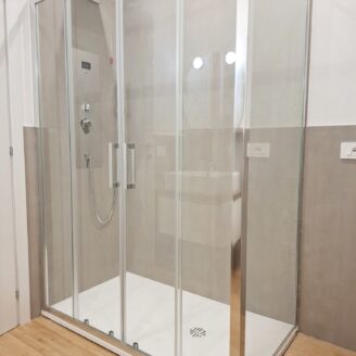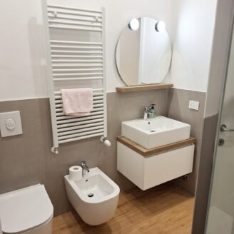 La zona notte comprende due camere matrimoniali con affaccio sul secondo balcone e due bagni, di cui uno dotato di doccia in vetro e predisposizione per la lavatrice.