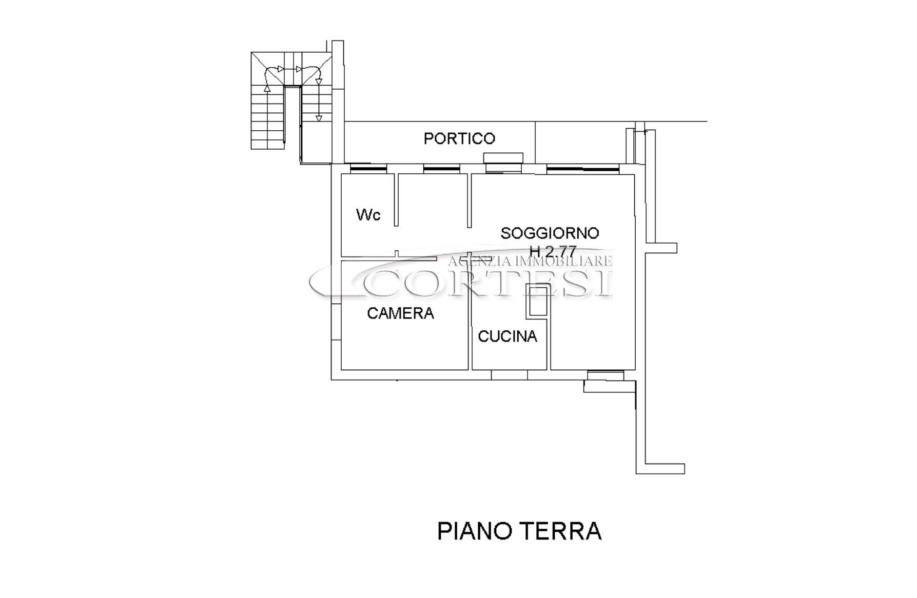 L’ingresso all’abitazione avviene attraverso un ampio portico che introduce ad un ampio soggiorno con cucina separata. La zona notte è composta da una camera, un bagno ed un grande disimpegno dove potrebbe essere realizzata una seconda cameretta.