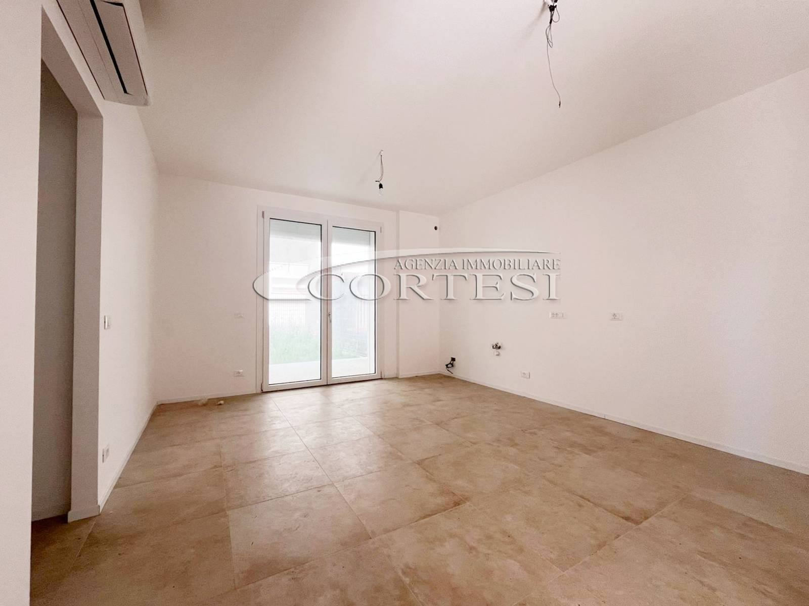 Appartamento fronte mare situato in palazzina di nuova costruzione in classe A4 posto al piano terra con ingresso indipendente composto da: ingresso su luminoso soggiorno con angolo cottura che tramite porta finestra collega al portico coperto e giardino privato disposto su due lati per un totale di 80mq, camera matrimoniale, cameretta e bagno finestrato con doccia. Inoltre possibilità di acquistare separatamente posto auto interno con cancello automatico a 12.000,00€.