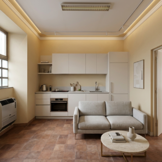 L’appartamento necessita di un intervento di restauro come dalle ipotesi di realizzo mostrate nei nostri rendering. Secondo una stima tecnica specializzata, con un investimento contenuto di circa 10.000€ è possibile ripristinare i locali e trasformarli in un appartamento di tendenza, perfetta da inserire anche nel circuito degli affitti brevi e di lusso.
