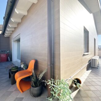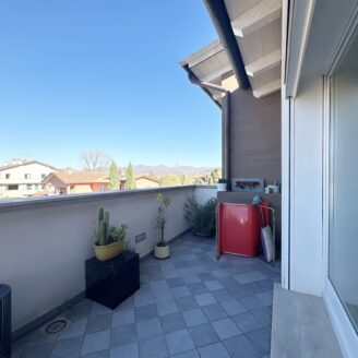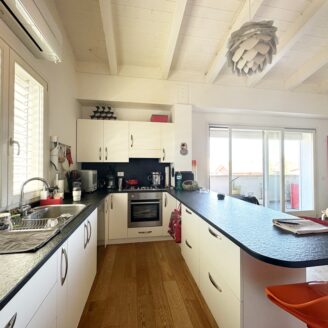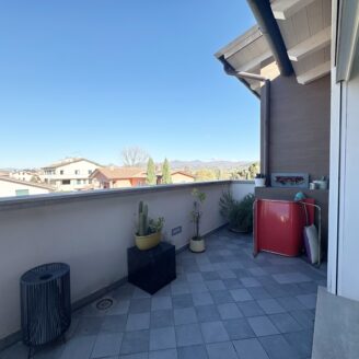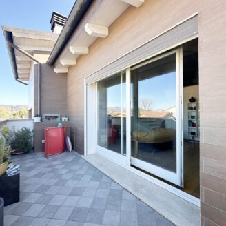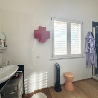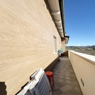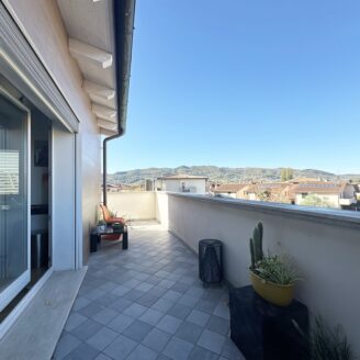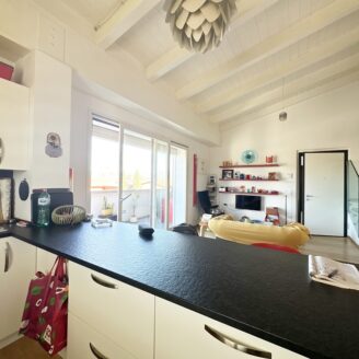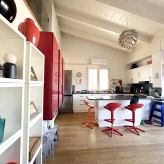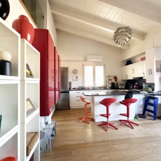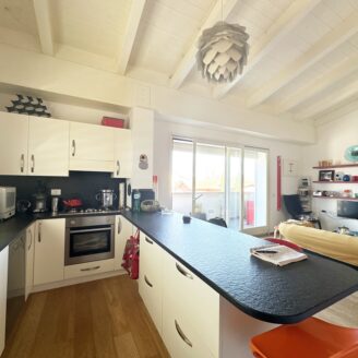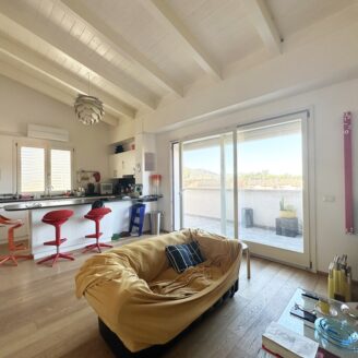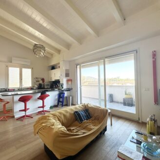 L’abitazione si distingue per la luminosità e gli spazi ben distribuiti: un’accogliente zona giorno open space con cucina a vista si apre direttamente su un ampio terrazzo che circonda l’appartamento su tre lati, ideale per momenti di relax e cene all’aperto.
