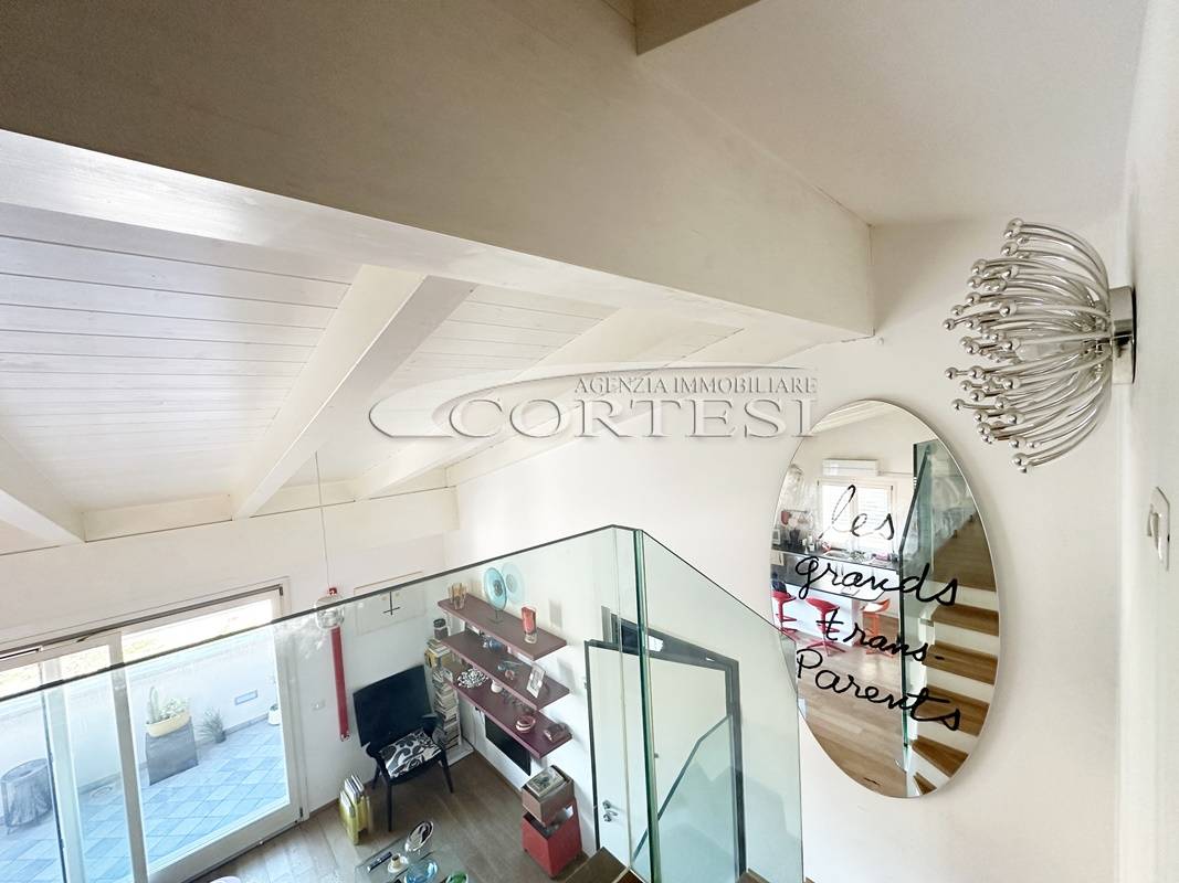 La zona notte è composta da due camere da letto e un bagno con doccia. Completa la proprietà un elegante soppalco che ospita una terza camera con bagno privato dotato di vasca, perfetto come suite o studio.