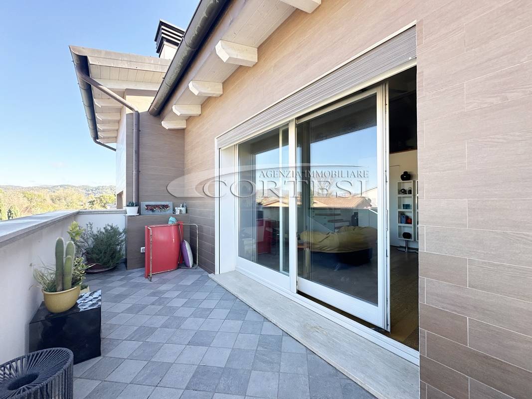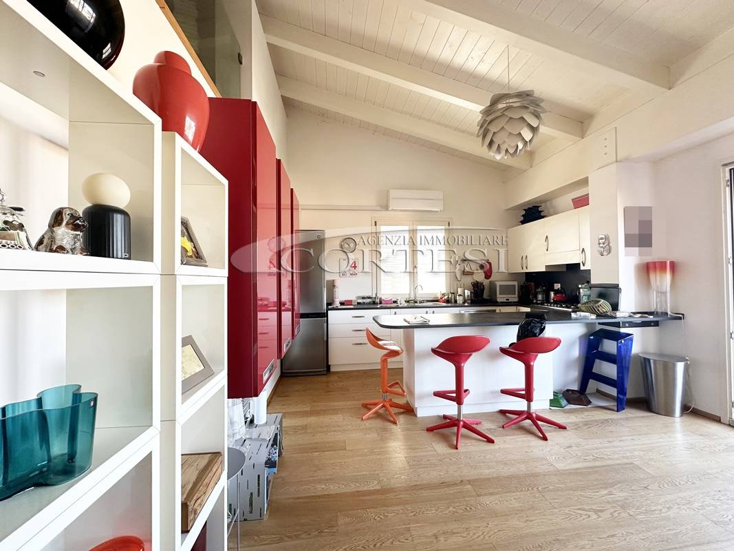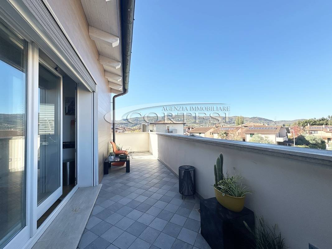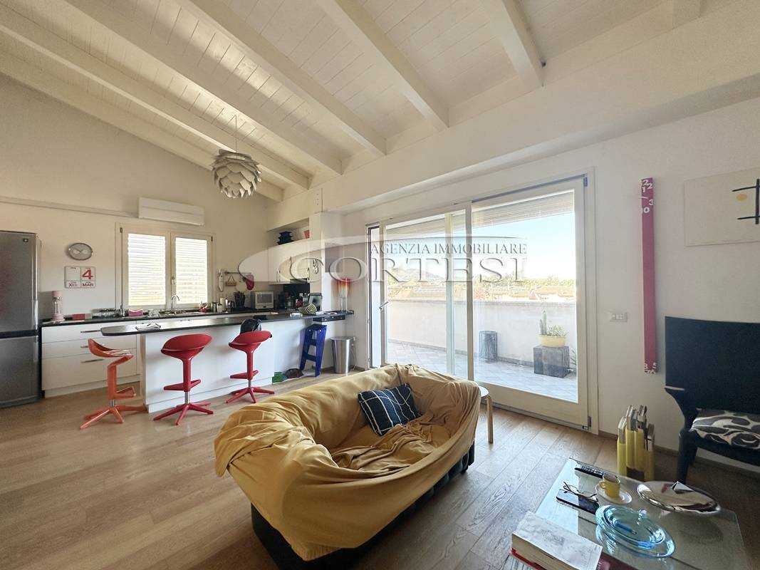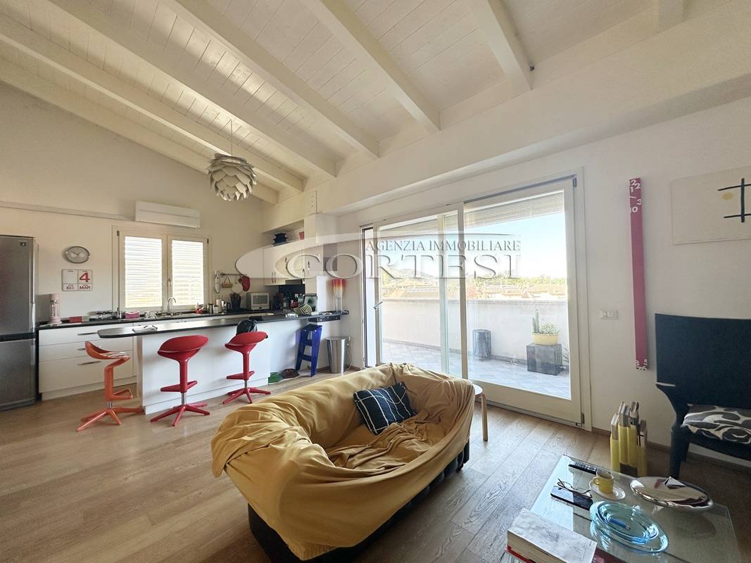 L’abitazione si distingue per la luminosità e gli spazi ben distribuiti: un’accogliente zona giorno open space con cucina a vista si apre direttamente su un ampio terrazzo che circonda l’appartamento su tre lati, ideale per momenti di relax e cene all’aperto.