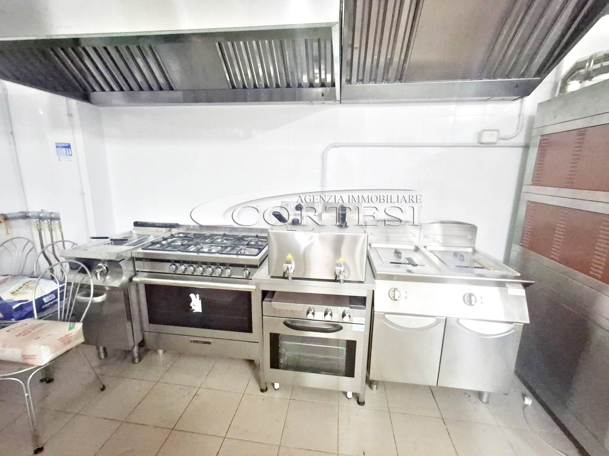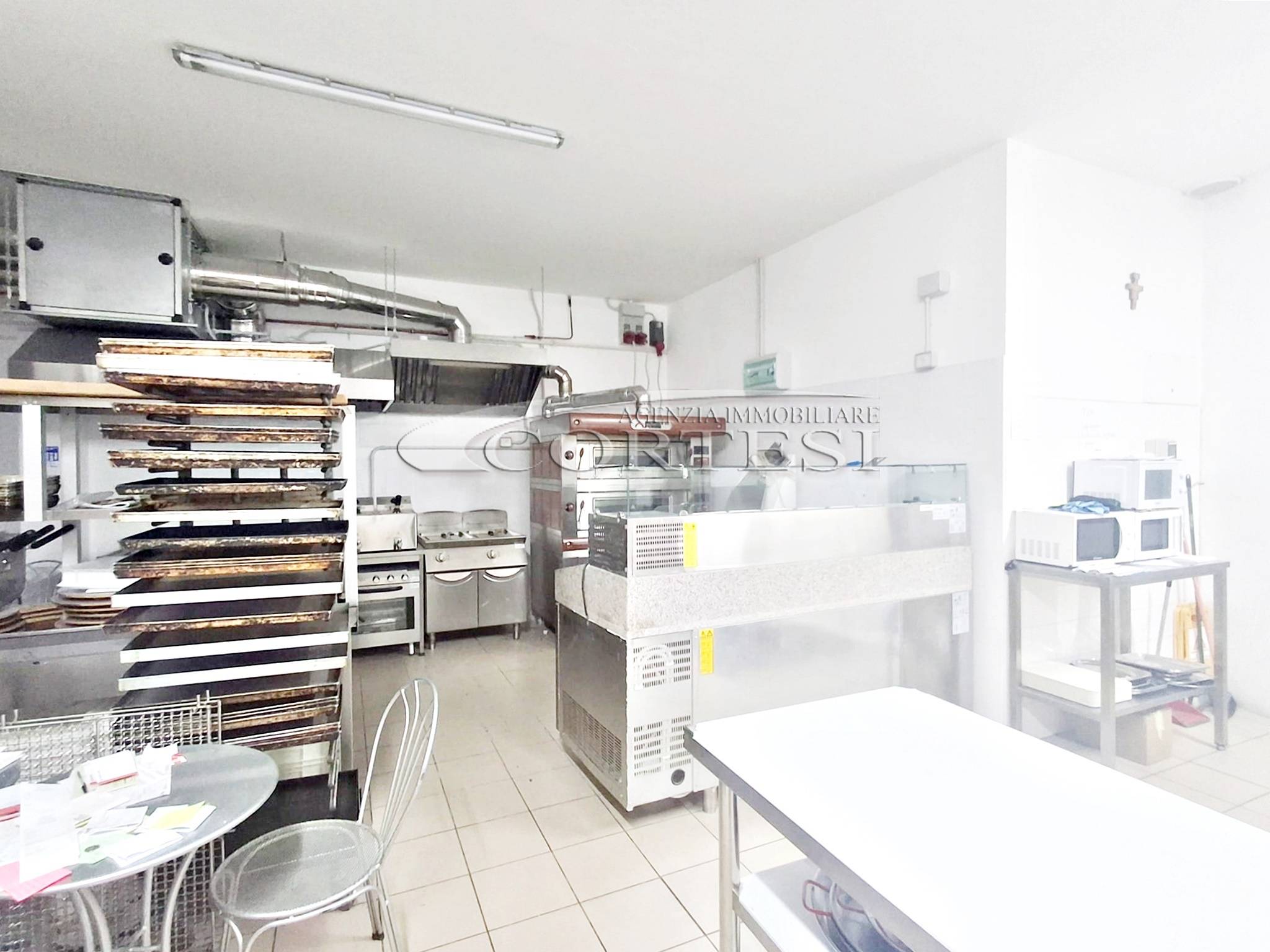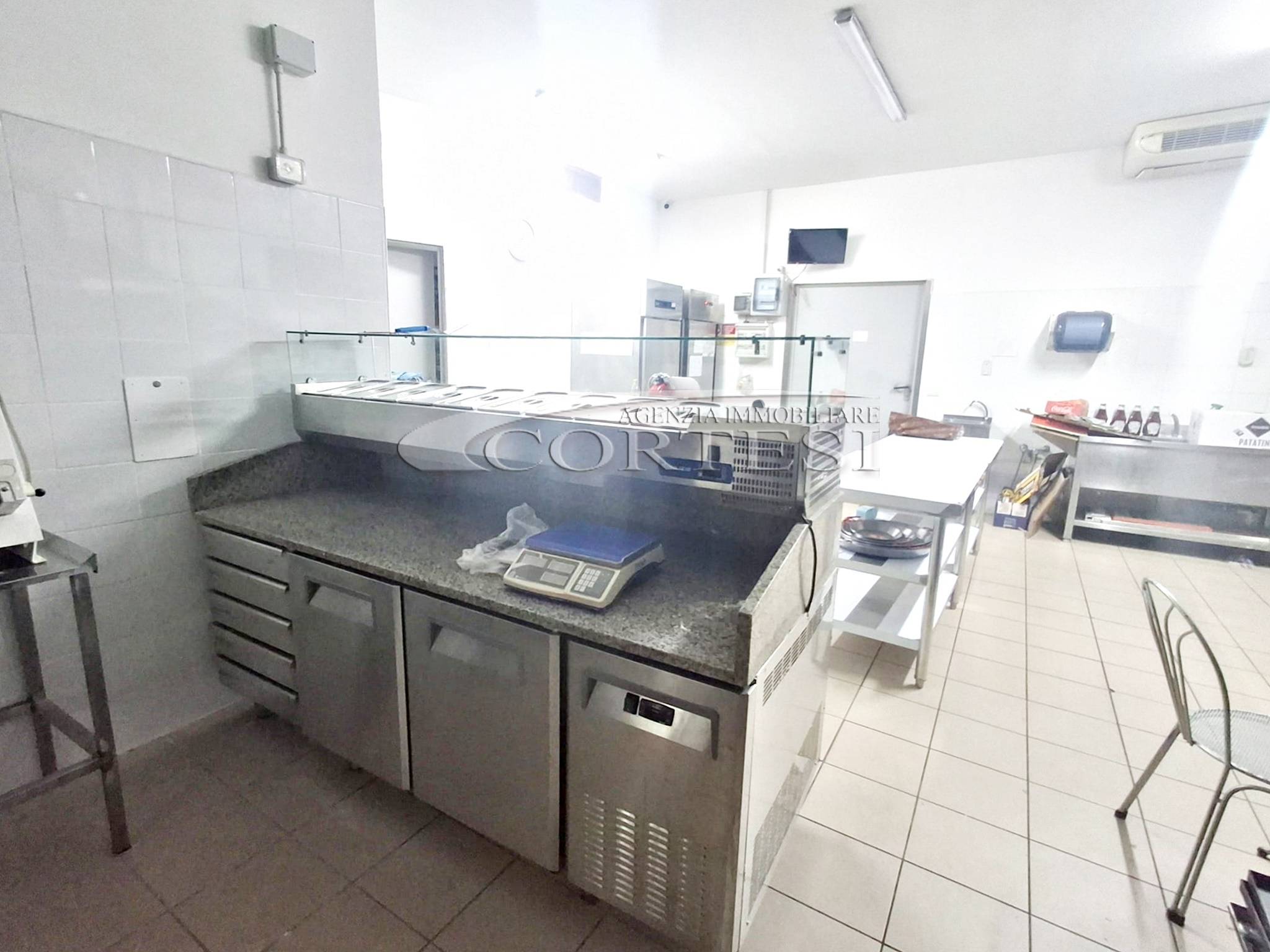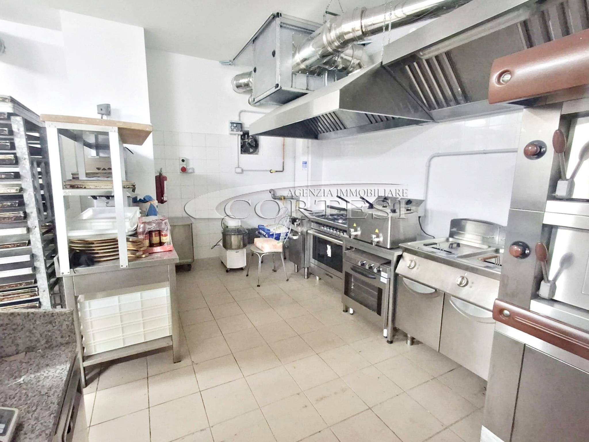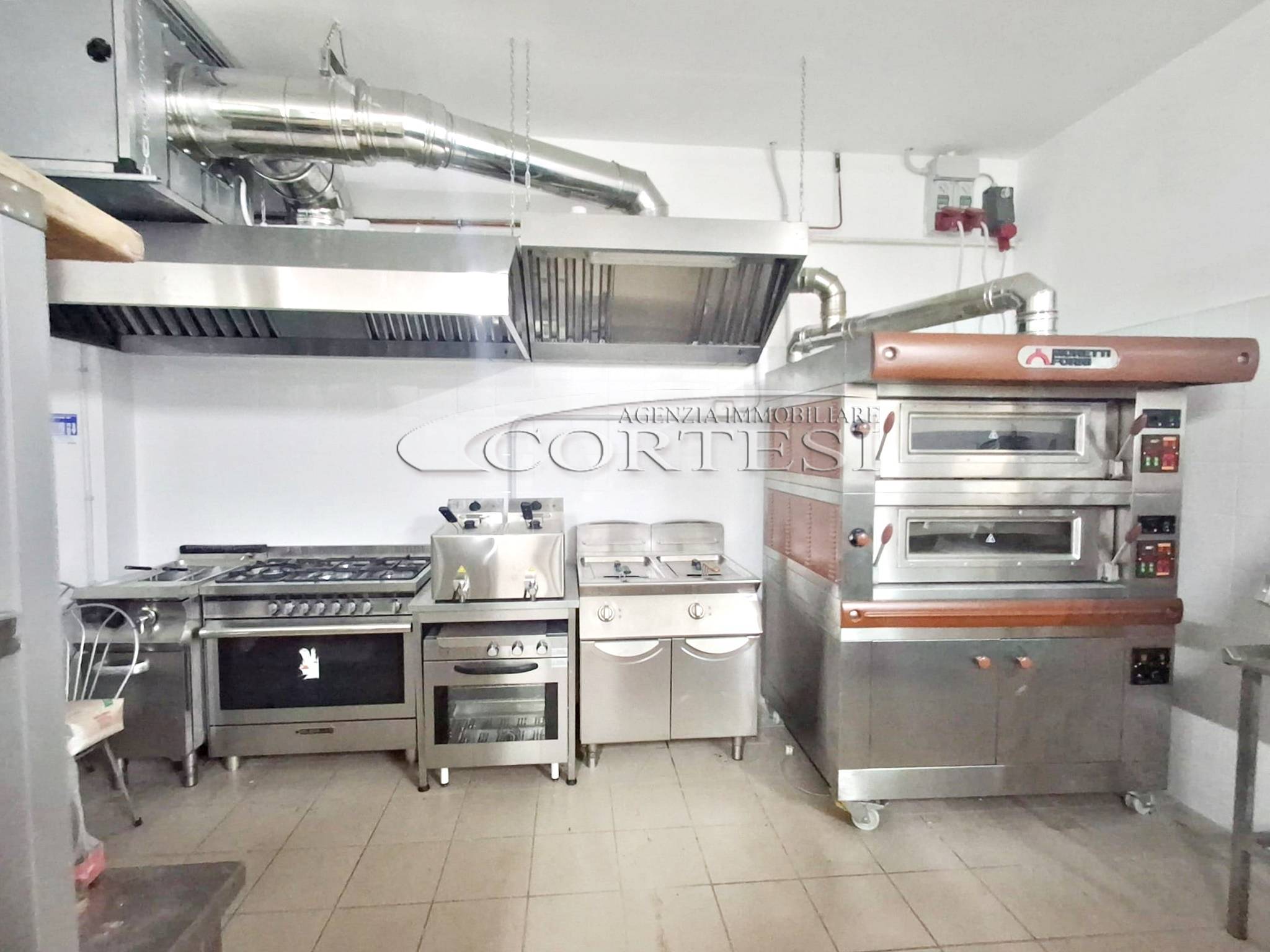 La cucina è completamente attrezzata e dispone di forno per pizza, fuochi, impastatrice, friggitrice e forno per spiedo, rendendo possibile l’ampliamento dell’offerta con pizzeria al taglio e d’asporto, hamburgeria e rosticceria.