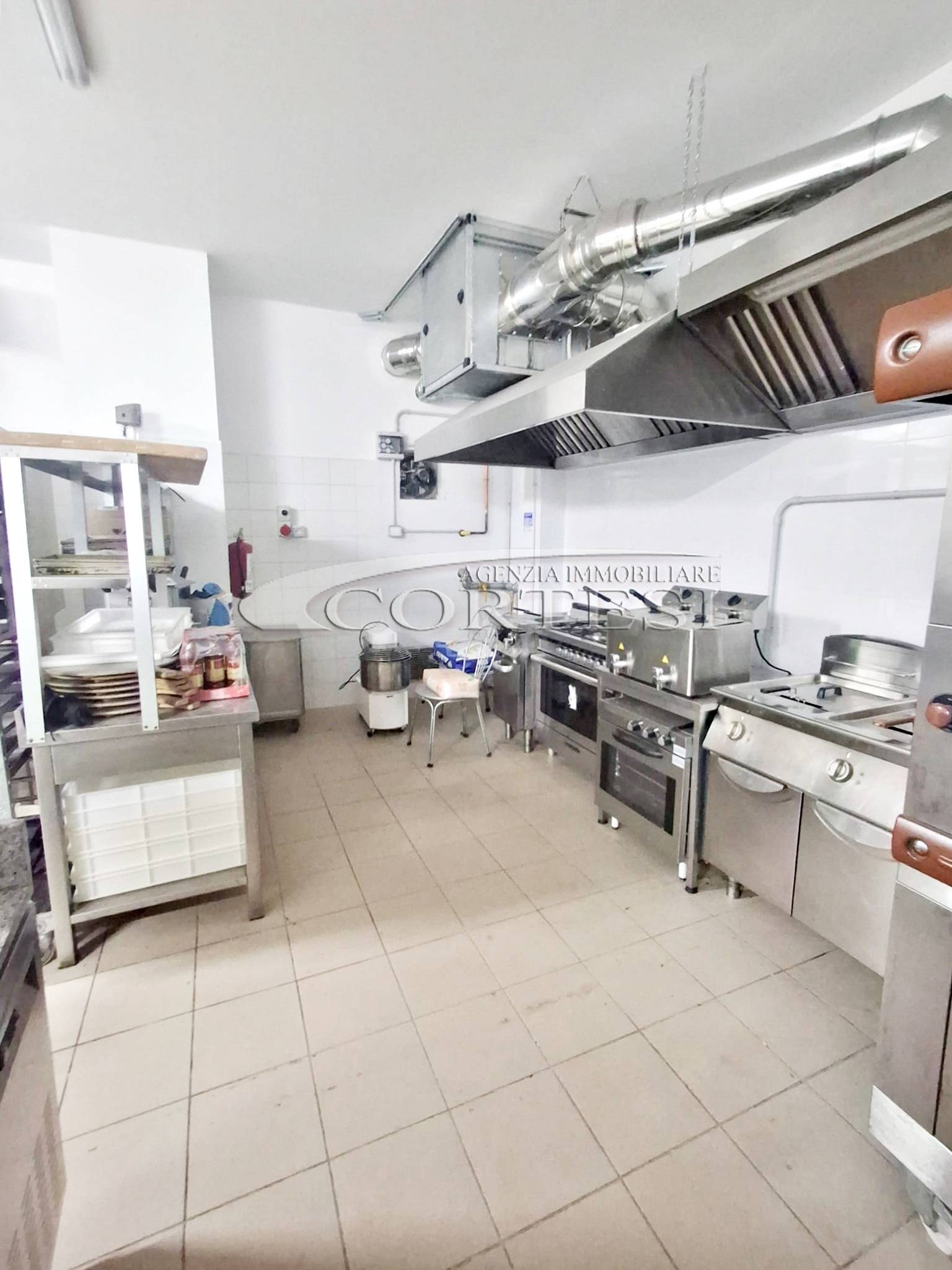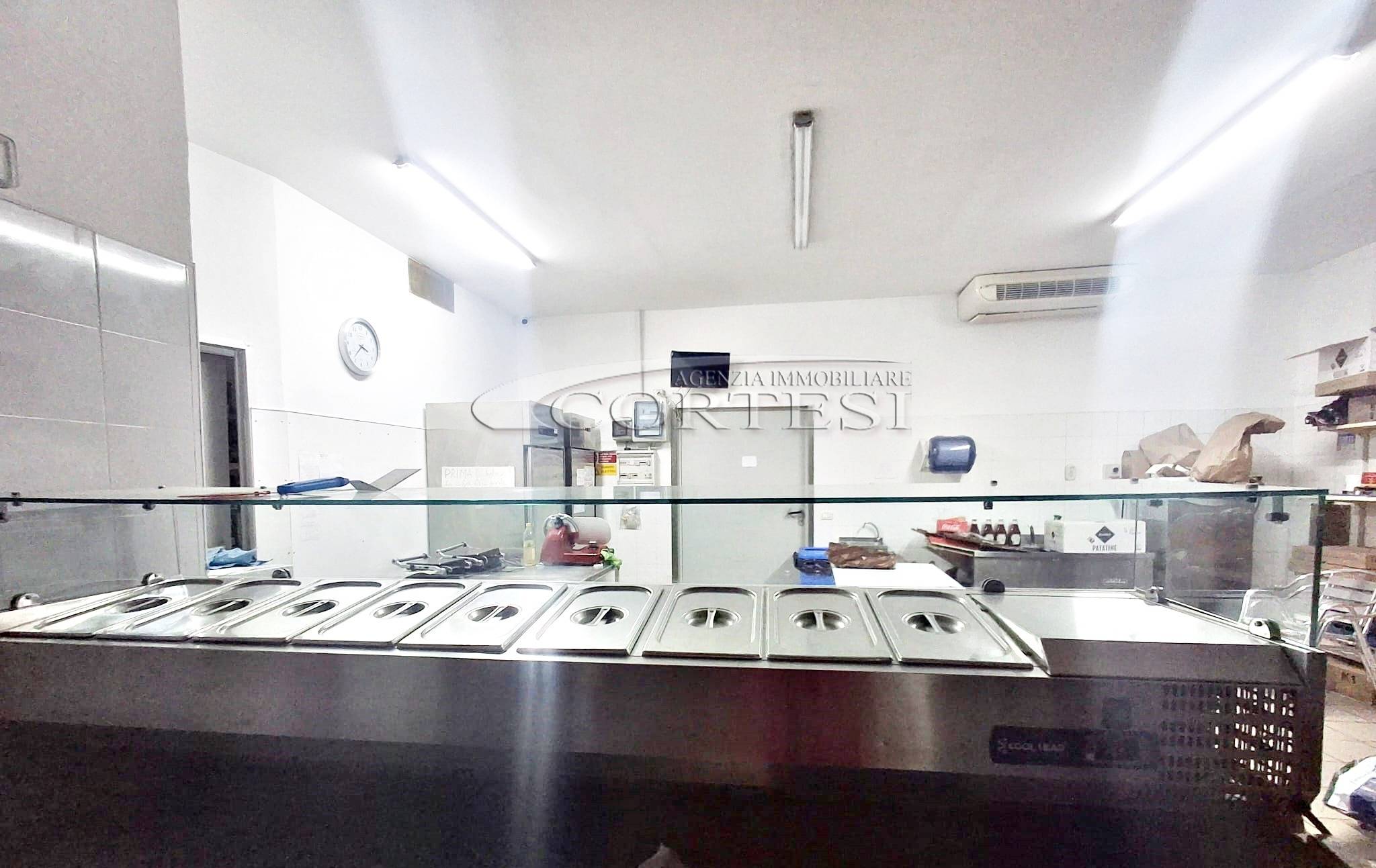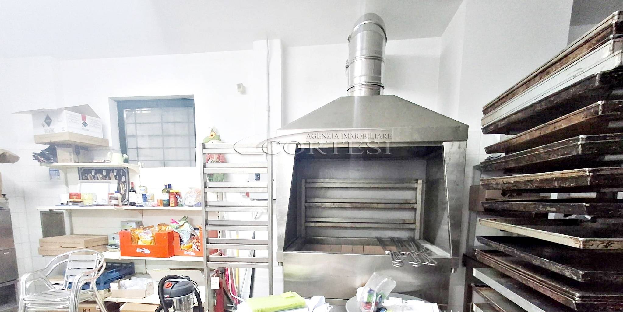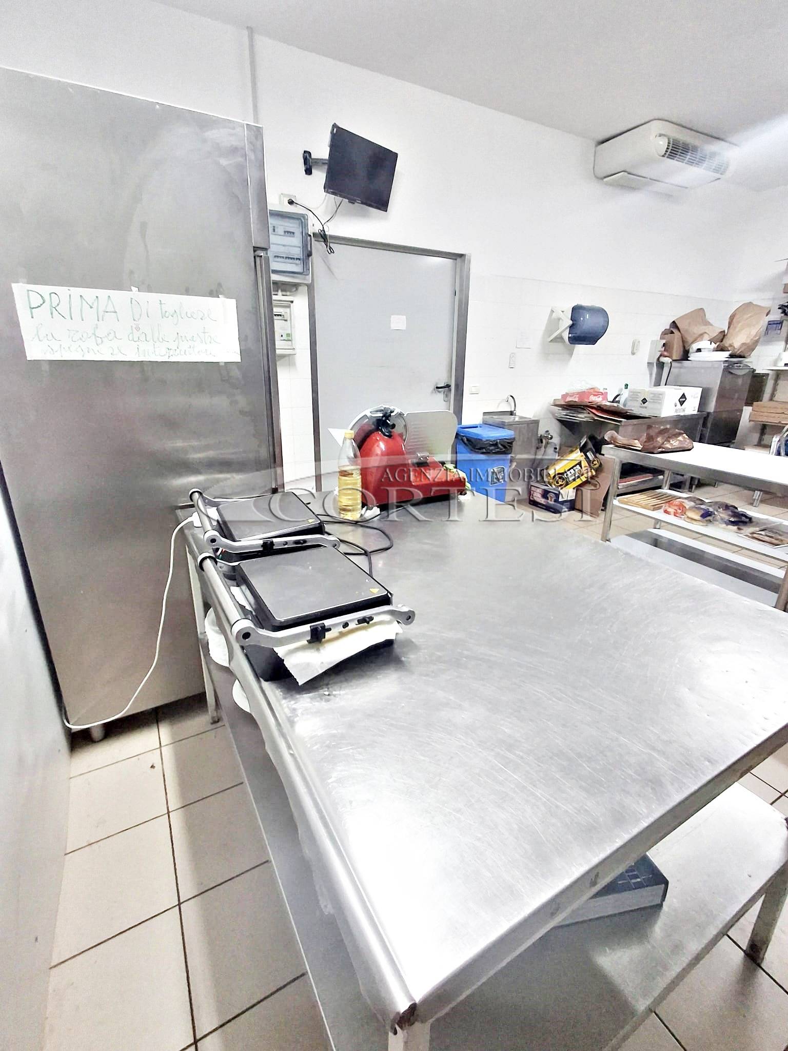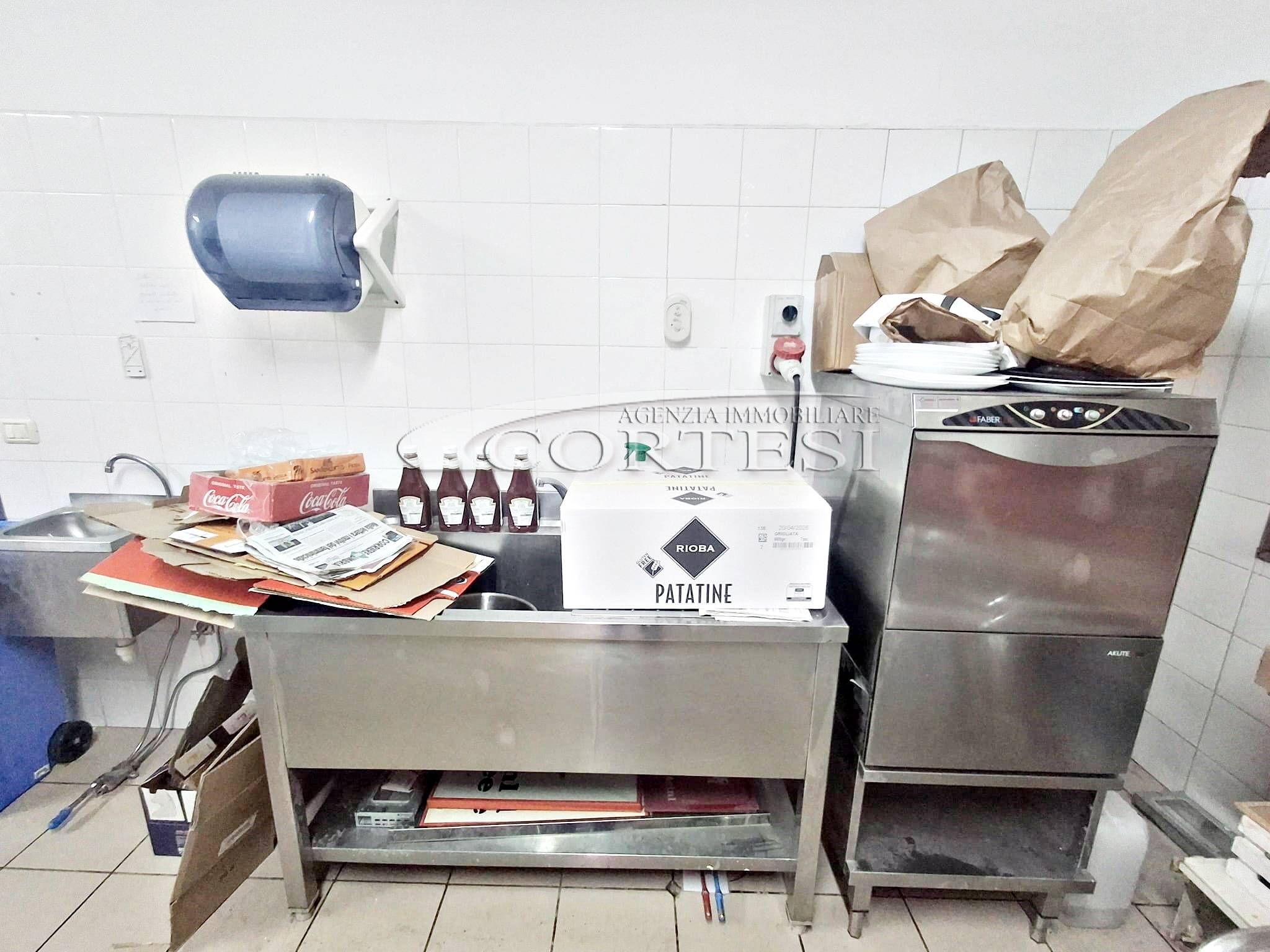La cucina è completamente attrezzata e dispone di forno per pizza, fuochi, impastatrice, friggitrice e forno per spiedo, rendendo possibile l’ampliamento dell’offerta con pizzeria al taglio e d’asporto, hamburgeria e rosticceria.