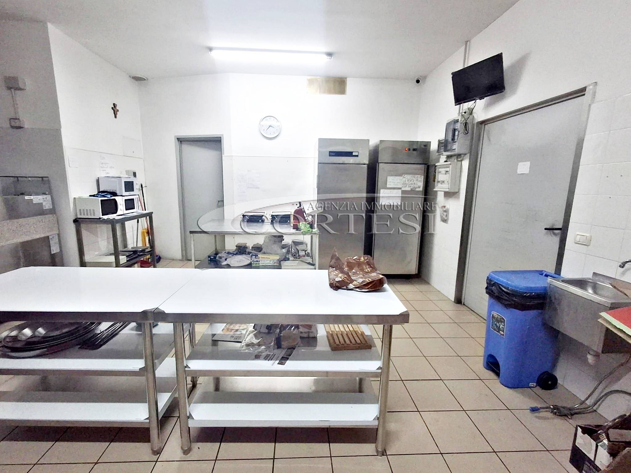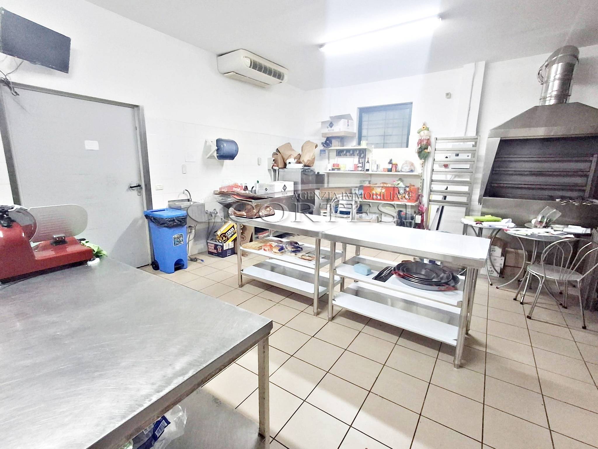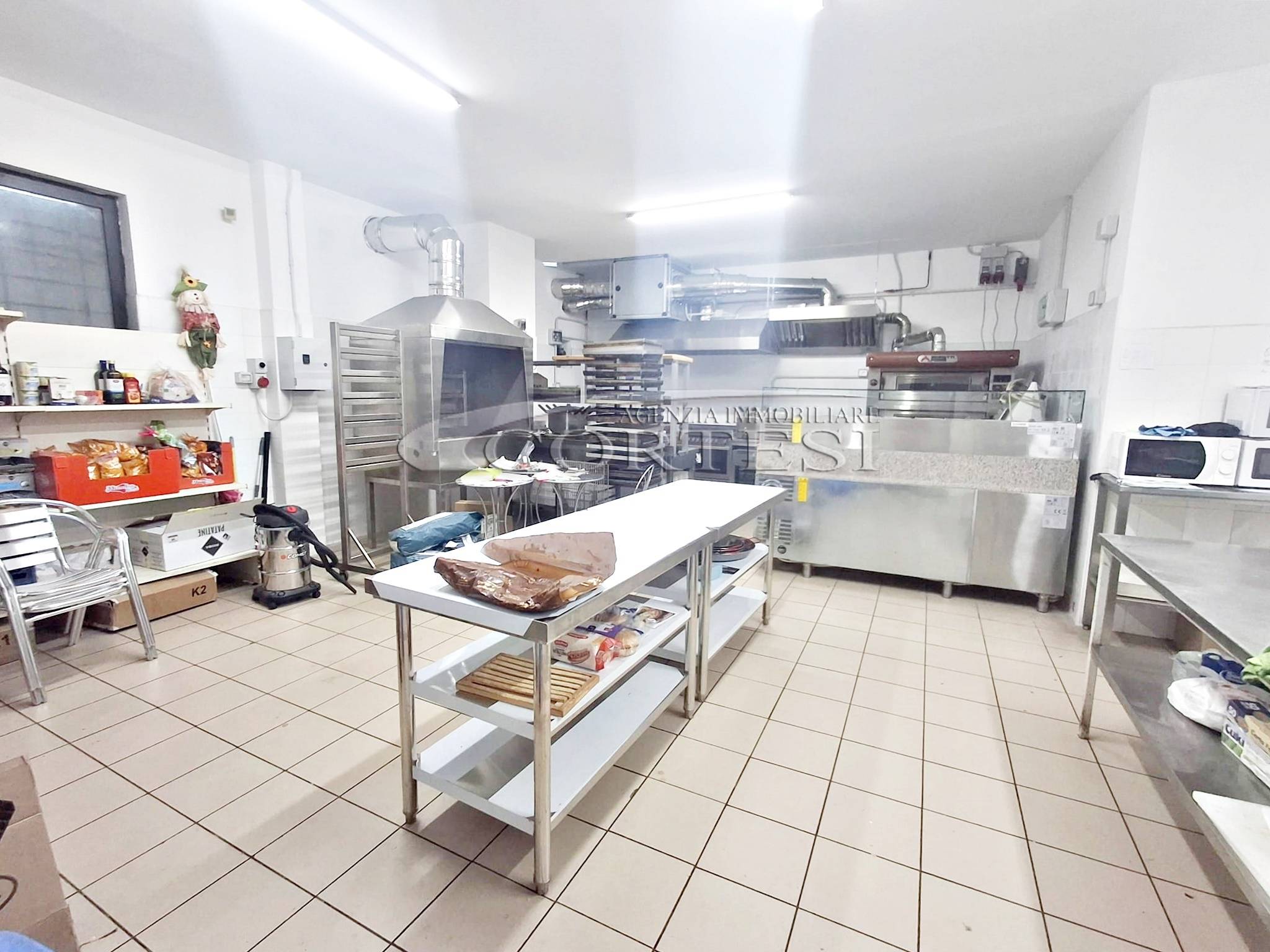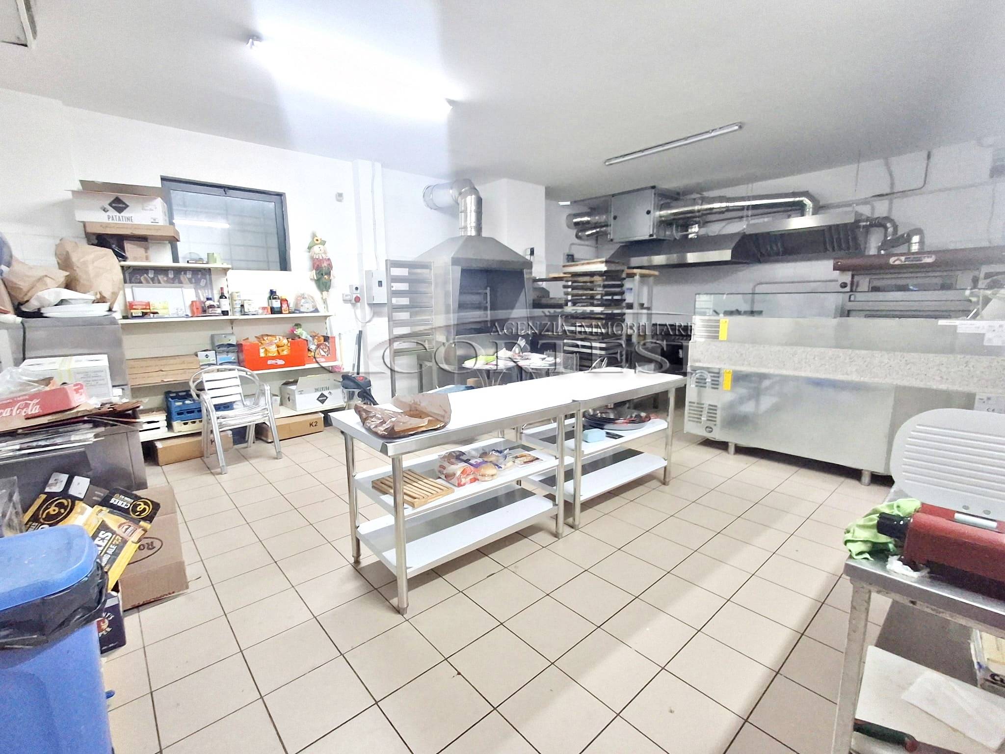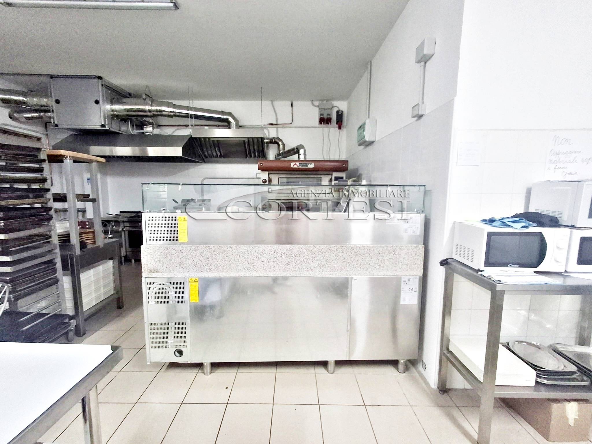 La cucina è completamente attrezzata e dispone di forno per pizza, fuochi, impastatrice, friggitrice e forno per spiedo, rendendo possibile l’ampliamento dell’offerta con pizzeria al taglio e d’asporto, hamburgeria e rosticceria.