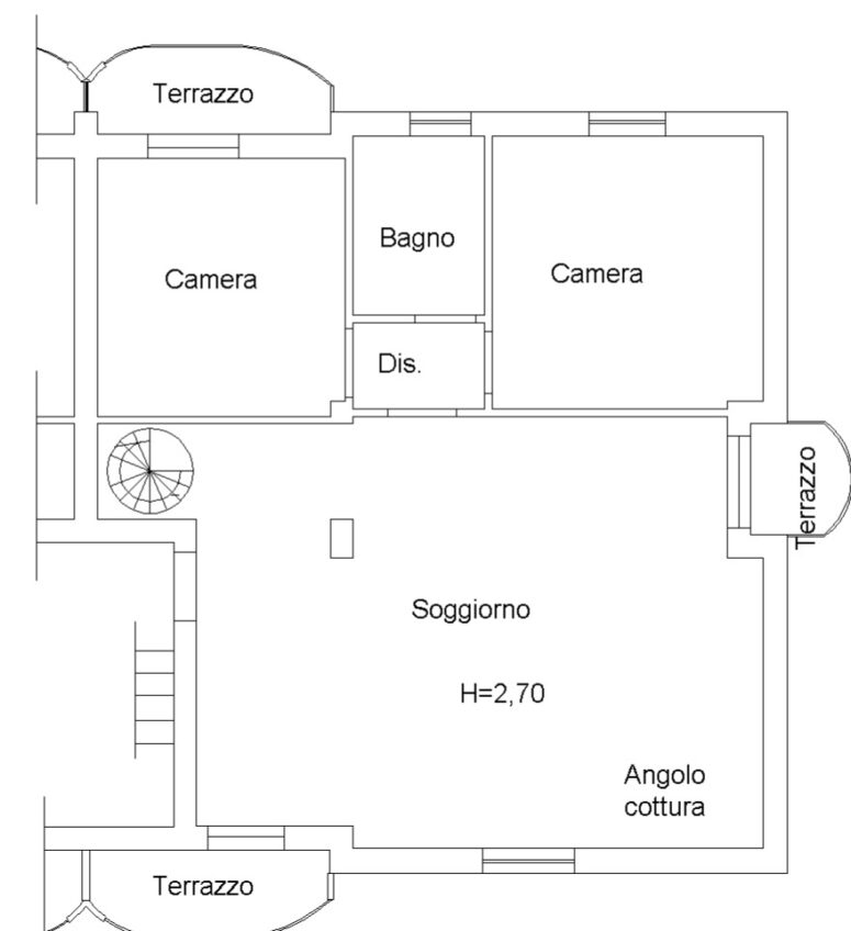Al primo piano troviamo: ampio soggiorno con angolo cottura, zona notte composta da due camere e bagno finestrato; Al secondo piano si sviluppa un’ulteriore zona living composta da: salotto, cucina e bagno con vasca con possibilità di 3° camera.