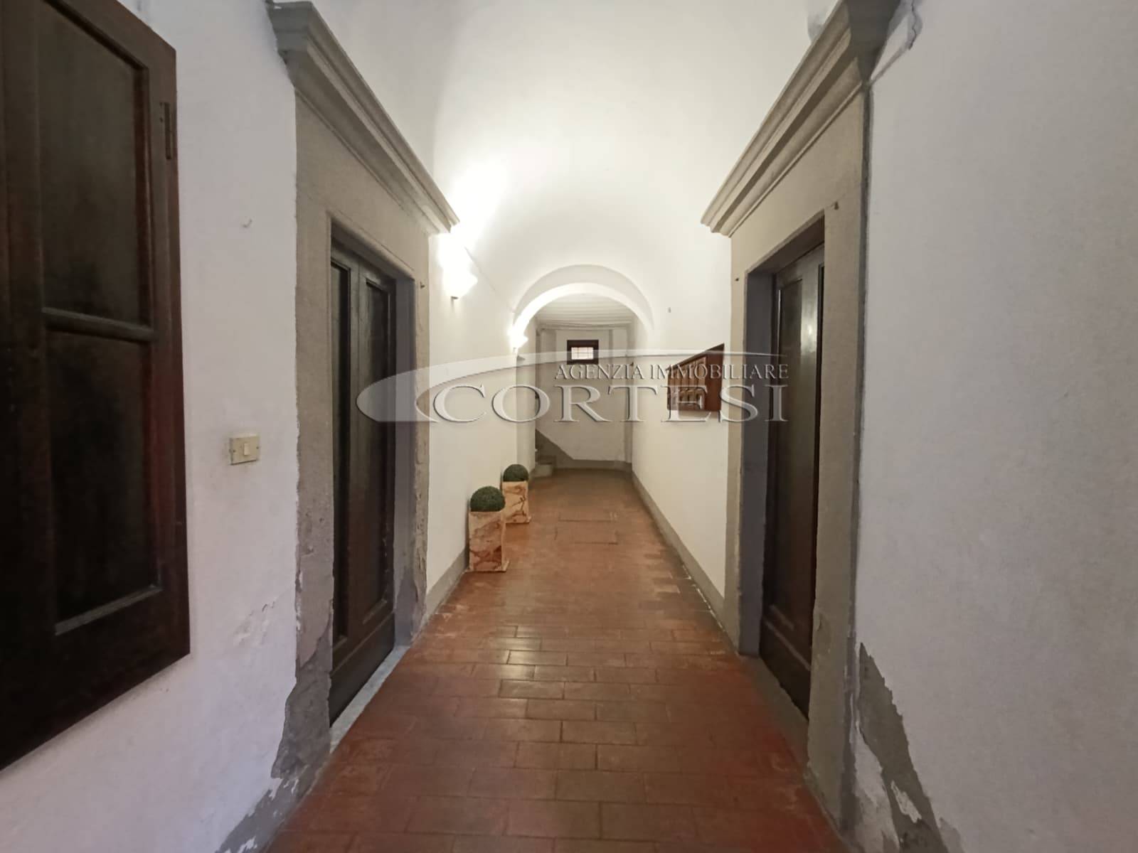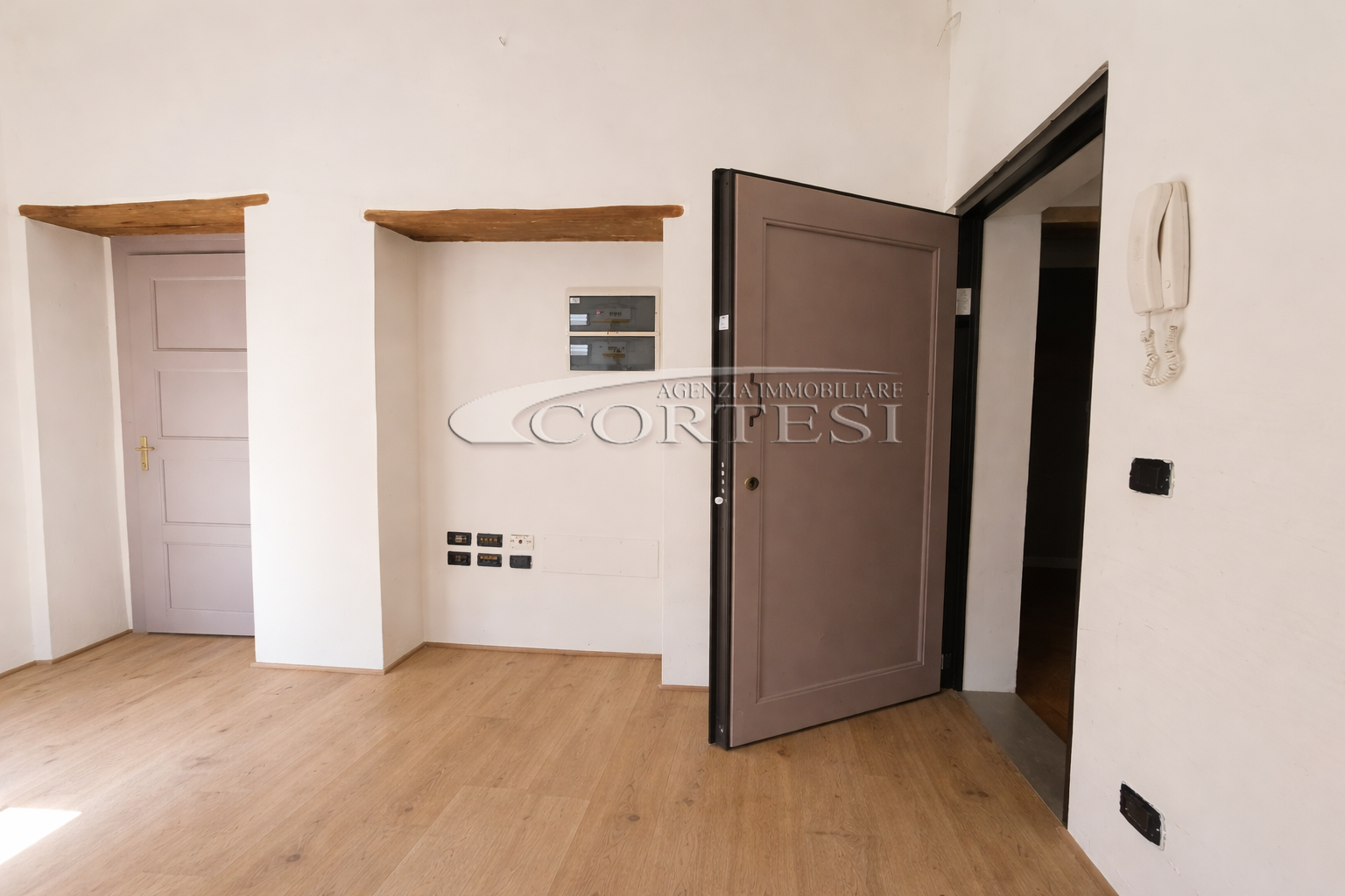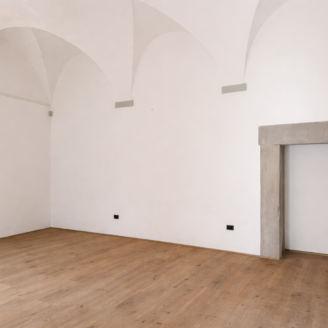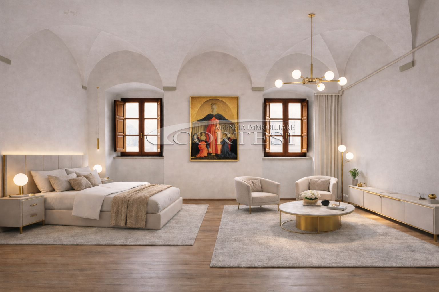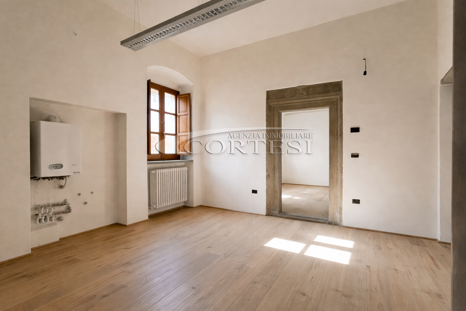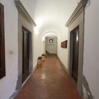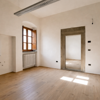 All’interno di Palazzo Giovagnoli, si propone in vendita un’unità immobiliare di 60 mq situata al secondo piano. L’immobile è stato oggetto di un intervento di ristrutturazione, eseguito con particolare cura nel recupero conservativo degli elementi storici preesistenti. La superficie interna si apre su un primo ambiente con predisposizioni impiantistiche per l’installazione di un’area cucina e servito da un locale igienico interamente rinnovato nelle finiture e nelle dotazioni. Il passaggio al secondo ambiente avviene attraverso una porta in pietra serena scolpita con l’incisione “Labore omnia florent”, qui troviamo un ampio vano. Grazie alla presenza della doppia finestratura, questo locale gode di una buona luminosità naturale, risultando ideale per una configurazione open-space atta a integrare la zona living e la zona notte.