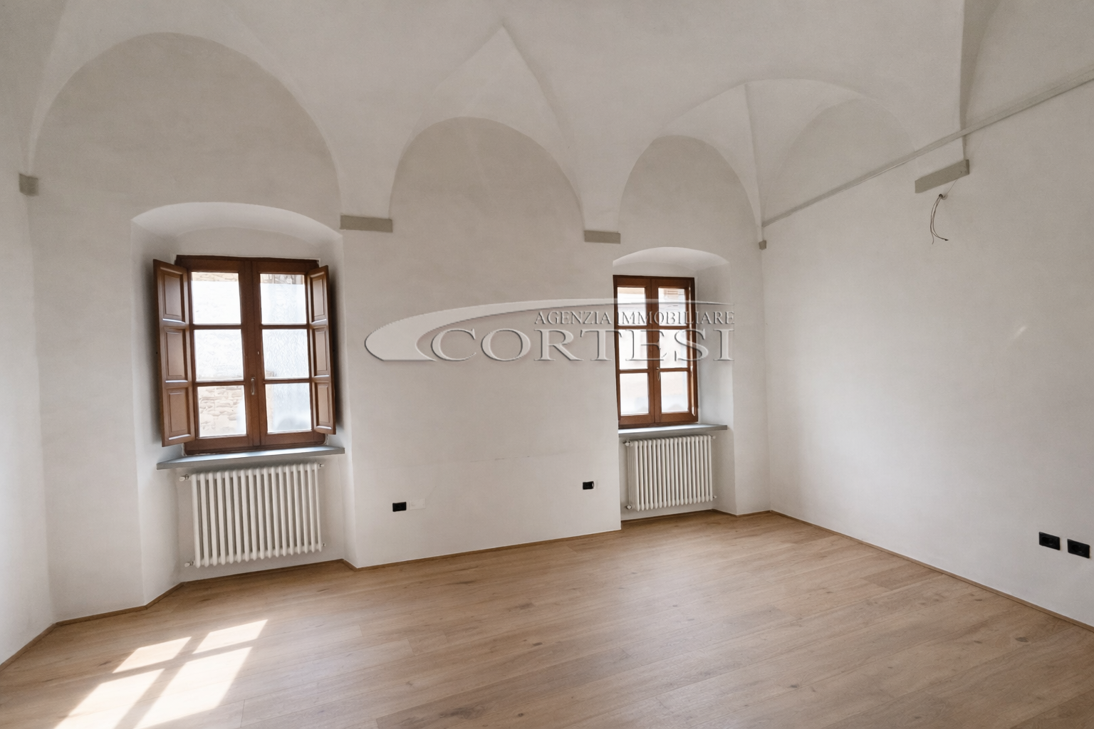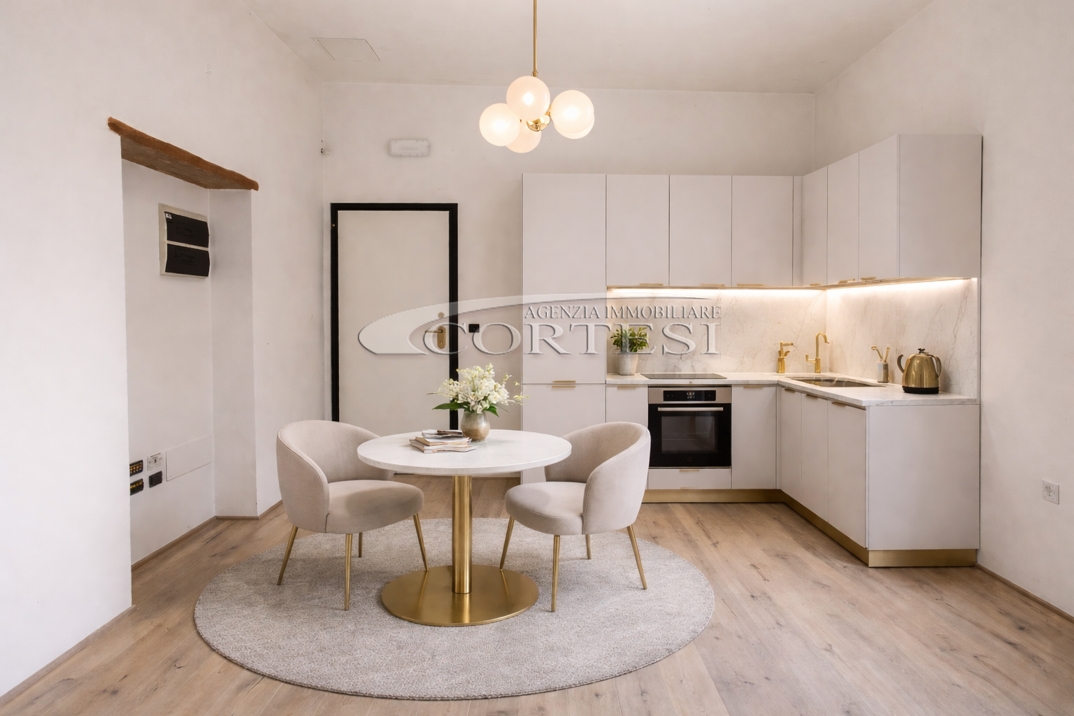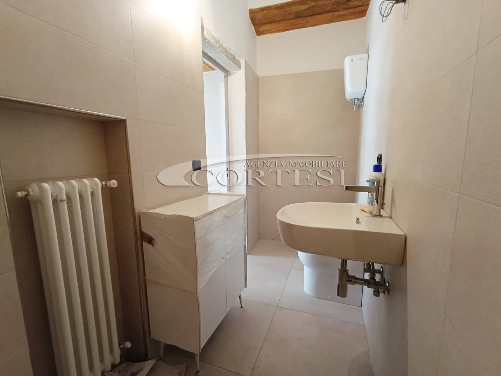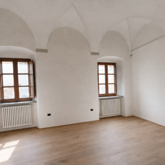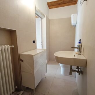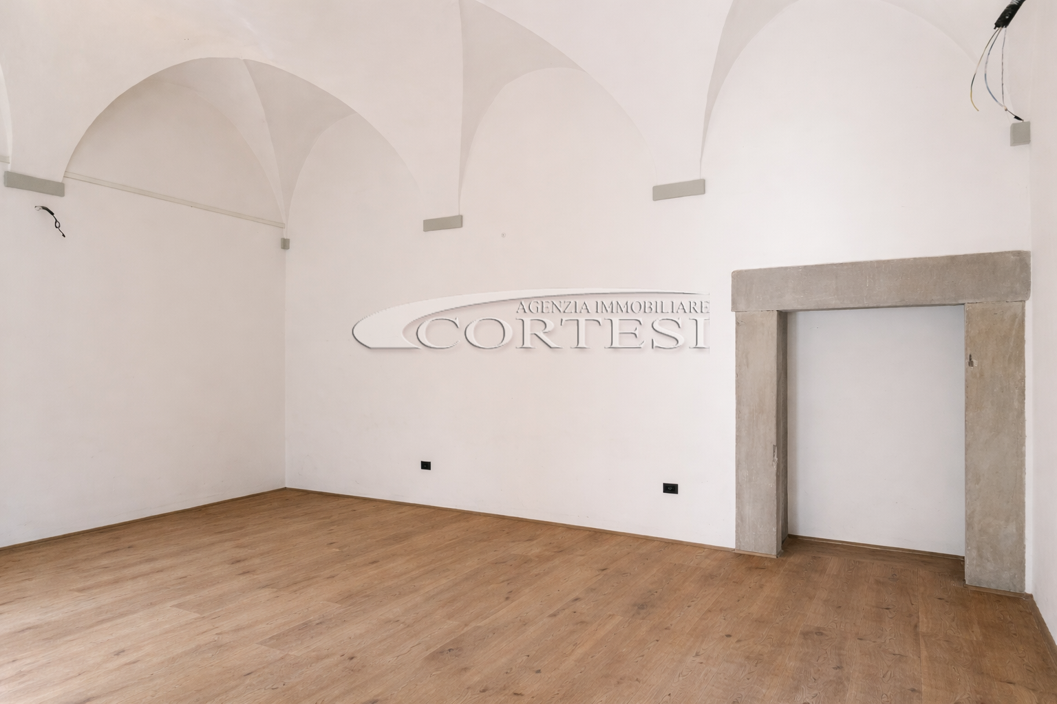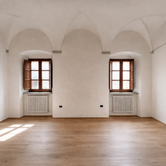 All’interno di Palazzo Giovagnoli, si propone in vendita un’unità immobiliare di 60 mq situata al secondo piano. L’immobile è stato oggetto di un intervento di ristrutturazione, eseguito con particolare cura nel recupero conservativo degli elementi storici preesistenti. La superficie interna si apre su un primo ambiente con predisposizioni impiantistiche per l’installazione di un’area cucina e servito da un locale igienico interamente rinnovato nelle finiture e nelle dotazioni. Il passaggio al secondo ambiente avviene attraverso una porta in pietra serena scolpita con l’incisione “Labore omnia florent”, qui troviamo un ampio vano. Grazie alla presenza della doppia finestratura, questo locale gode di una buona luminosità naturale, risultando ideale per una configurazione open-space atta a integrare la zona living e la zona notte.