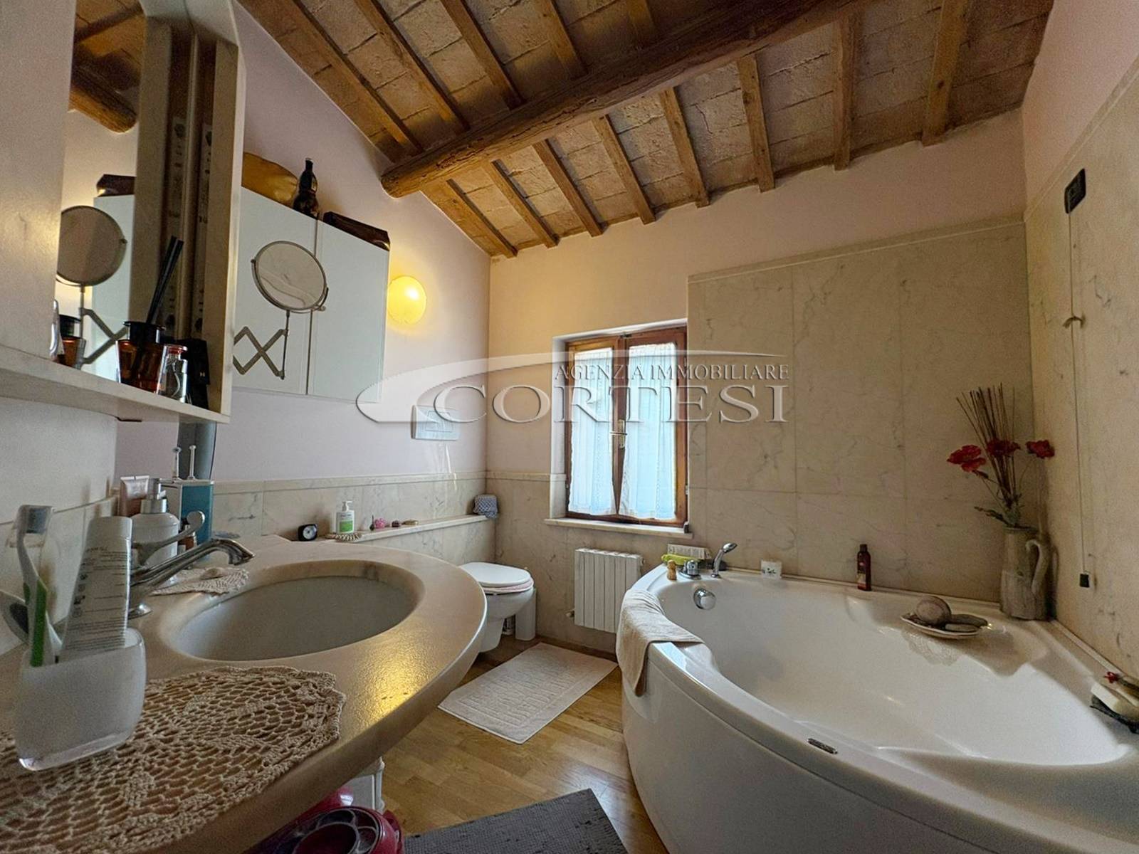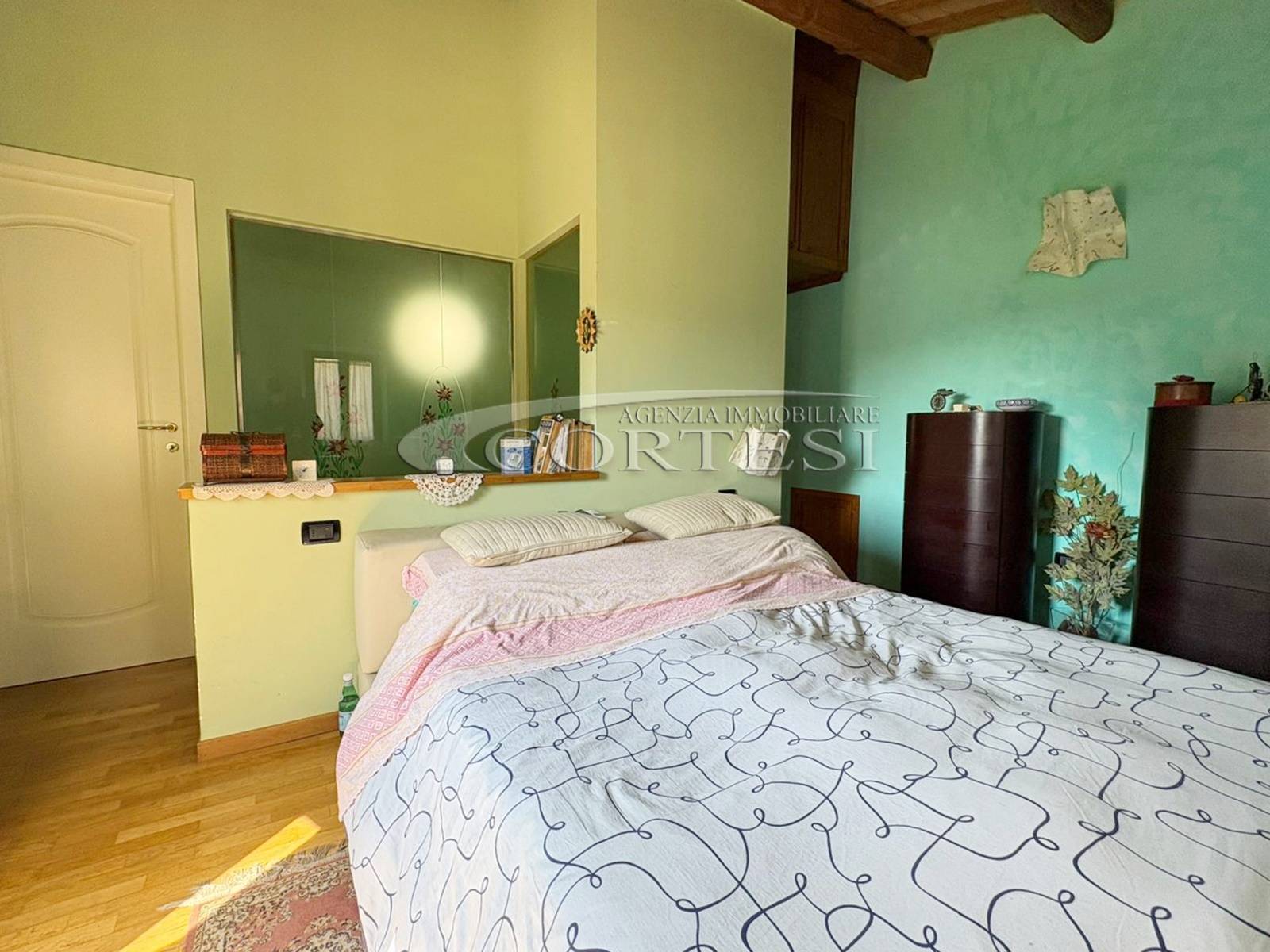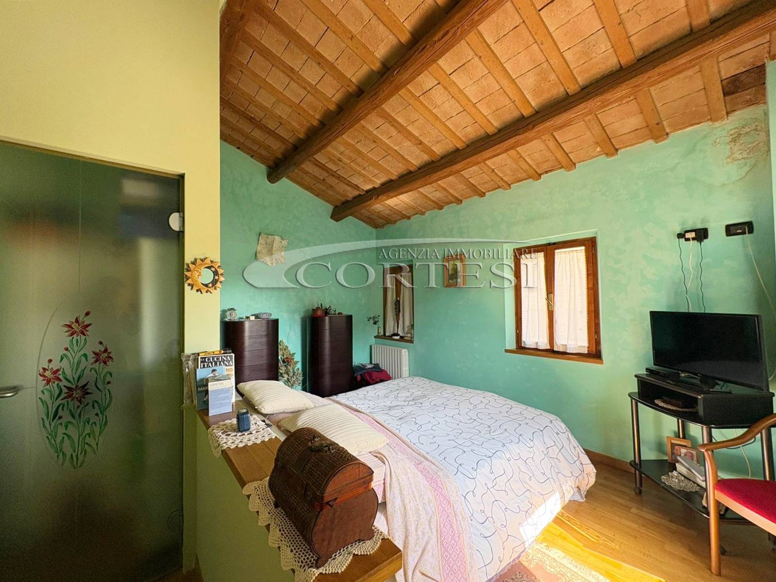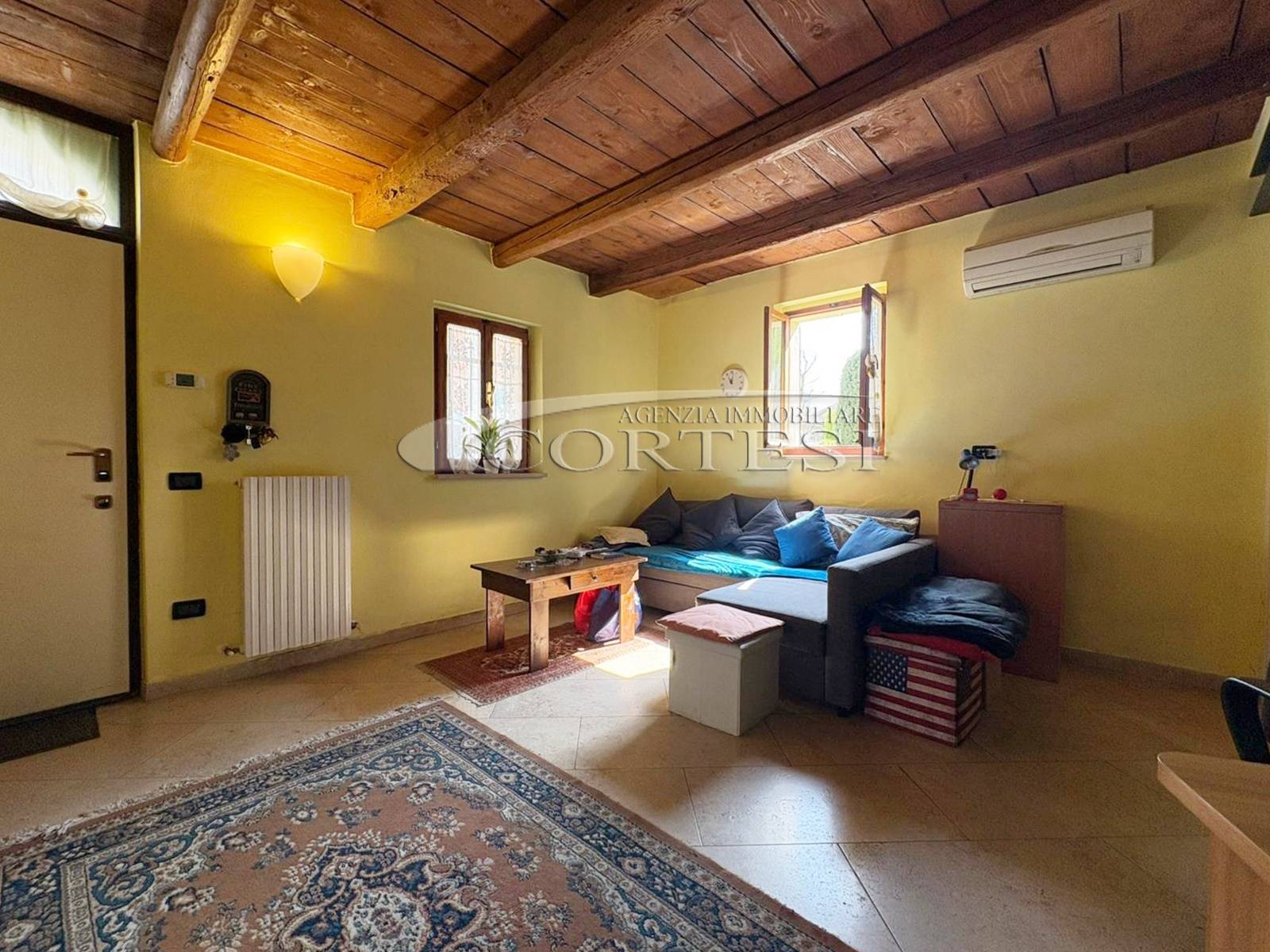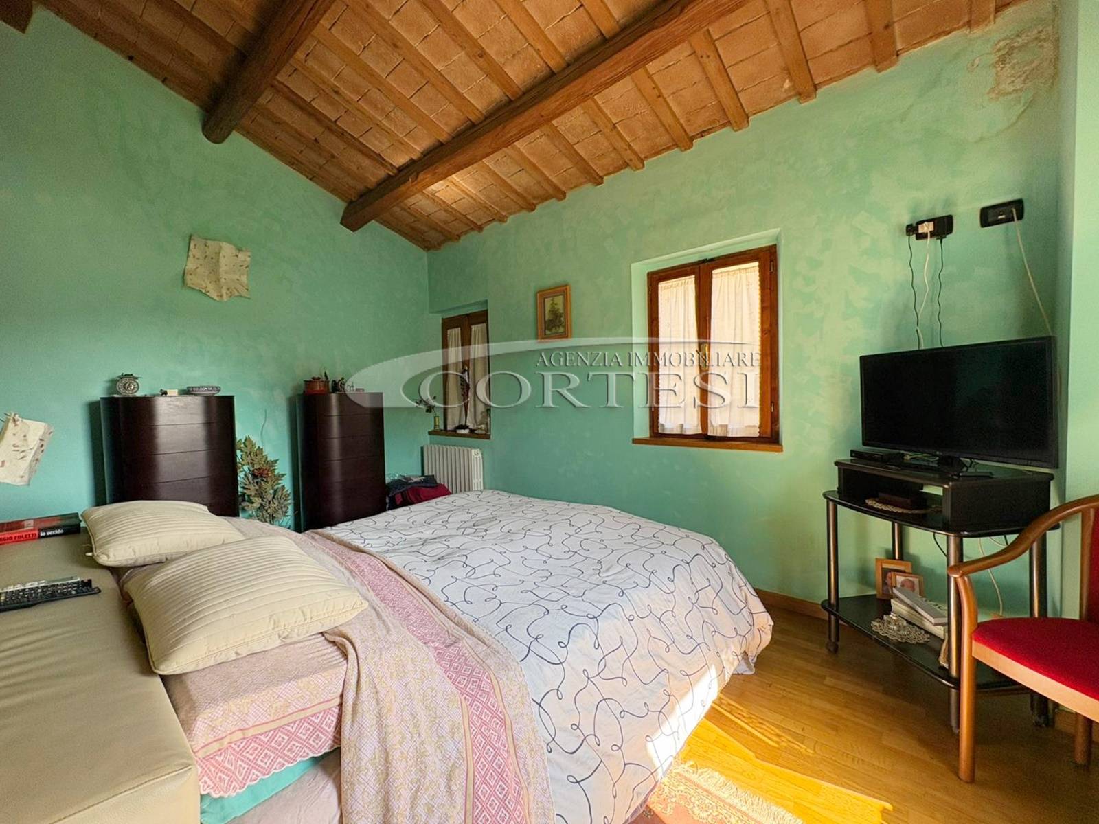 L’ingresso a piano terra si apre su un luminoso soggiorno impreziosito da suggestive travi a vista, elemento distintivo che dona calore e carattere a tutti gli ambienti della casa, bagno di servizio e completa il piano una cucina abitabile, funzionale e accogliente, con accesso diretto al giardino privato, ideale per momenti di relax all’aria aperta.