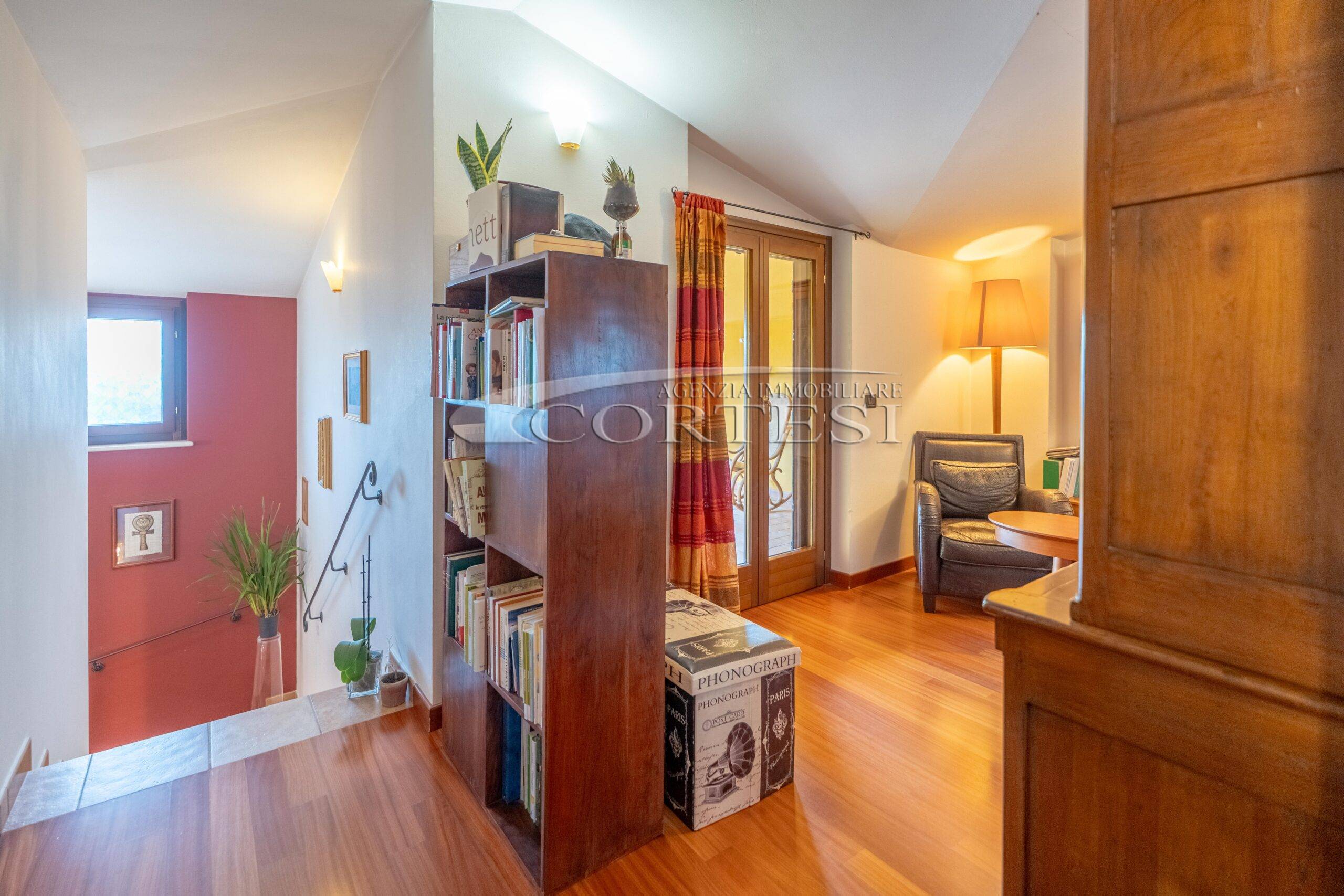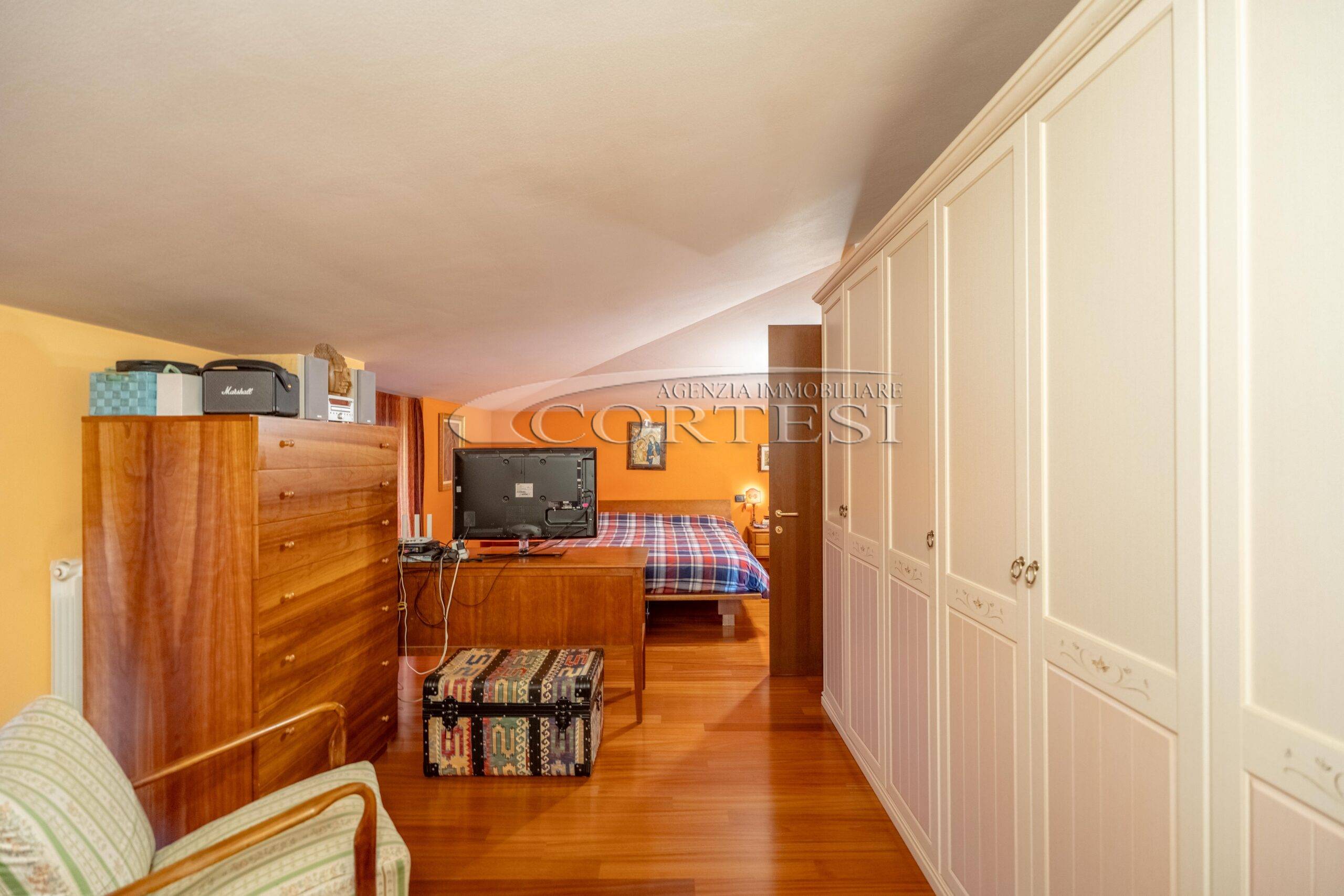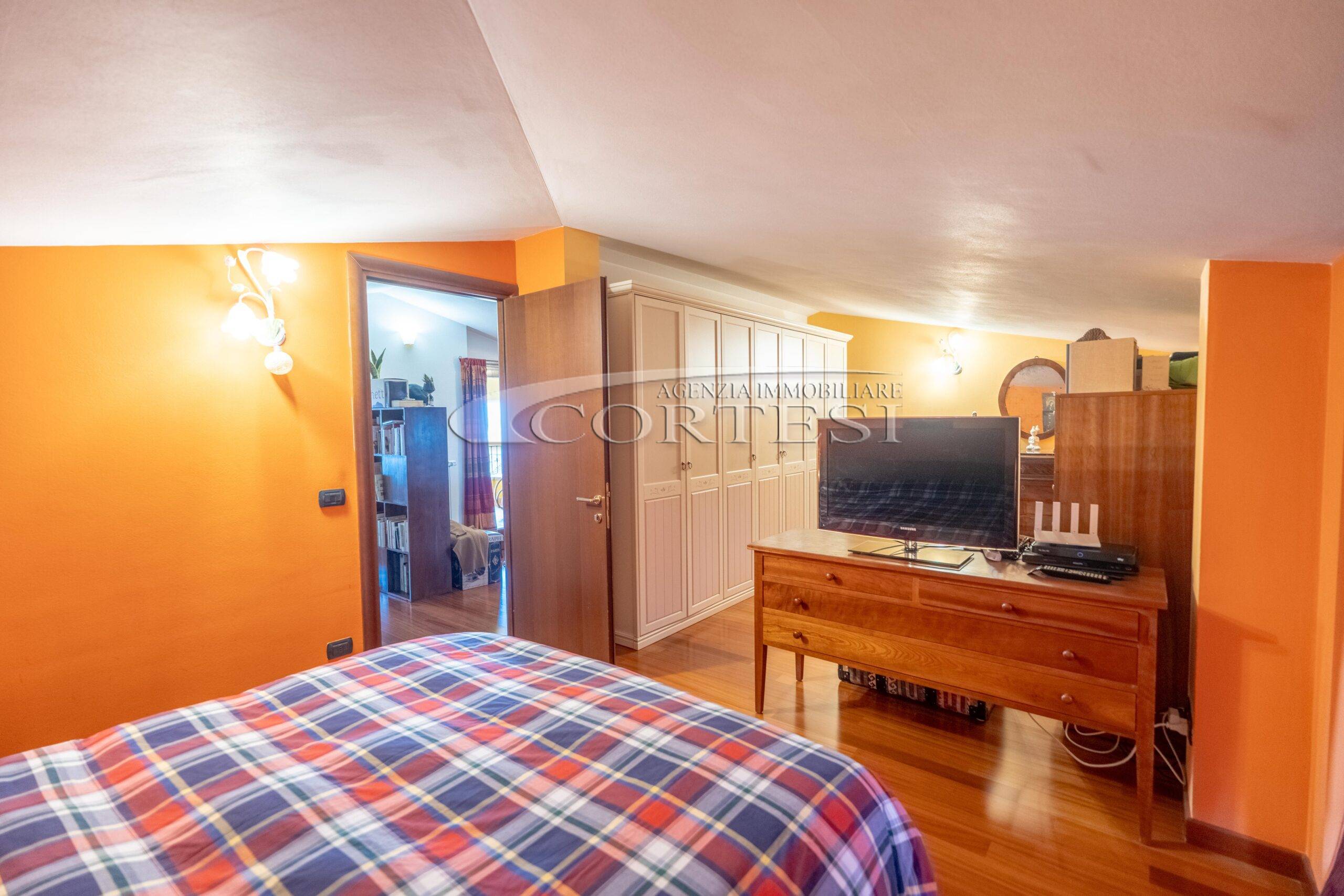 Il primo piano, rifinito con pavimento in parquet, è mansardato, ma con altezze comode, ed ospita una spaziosa camera matrimoniale doppia ed un secondo bagno oltre a terrazzo panoramico; il piano seminterrato comprende un garage doppio ed una taverna con cucina, camino e ulteriore bagno. Una scala esterna ci conduce ad uno studio con ingresso indipendente ideale per chi esercita una libera professione e necessita di accogliere clienti ma senza passare dalla zona abitativa.